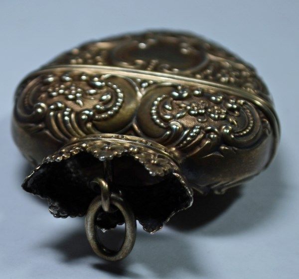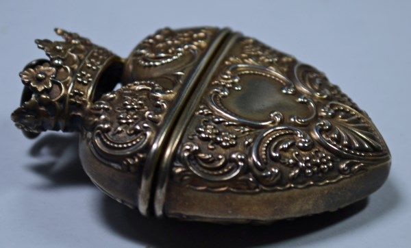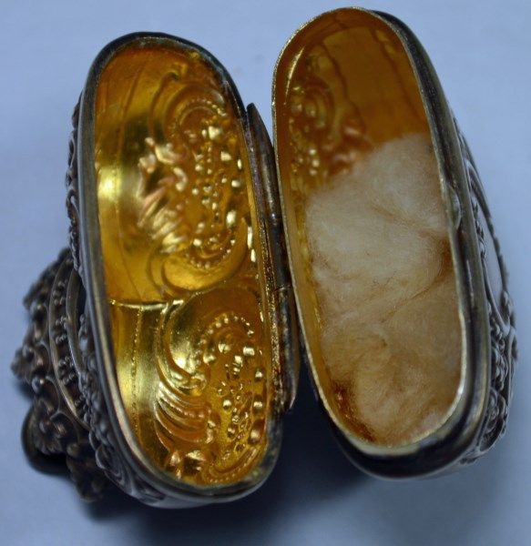 Measures 2.25" long. Still has cotton soaked with perfume in it. Nice Patina