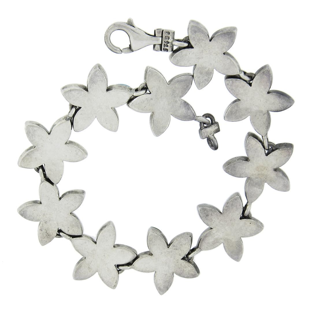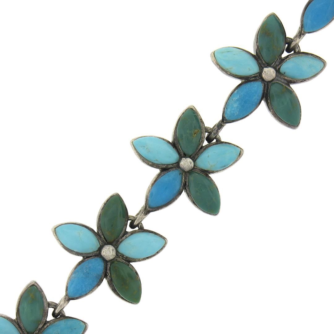A vintage solid silver floral bracelet, featuring 50 marquise shape natural turquoise. It weighs a total of 31.94 grams, measures 16.1mm wide, and measures 7 inches in length.