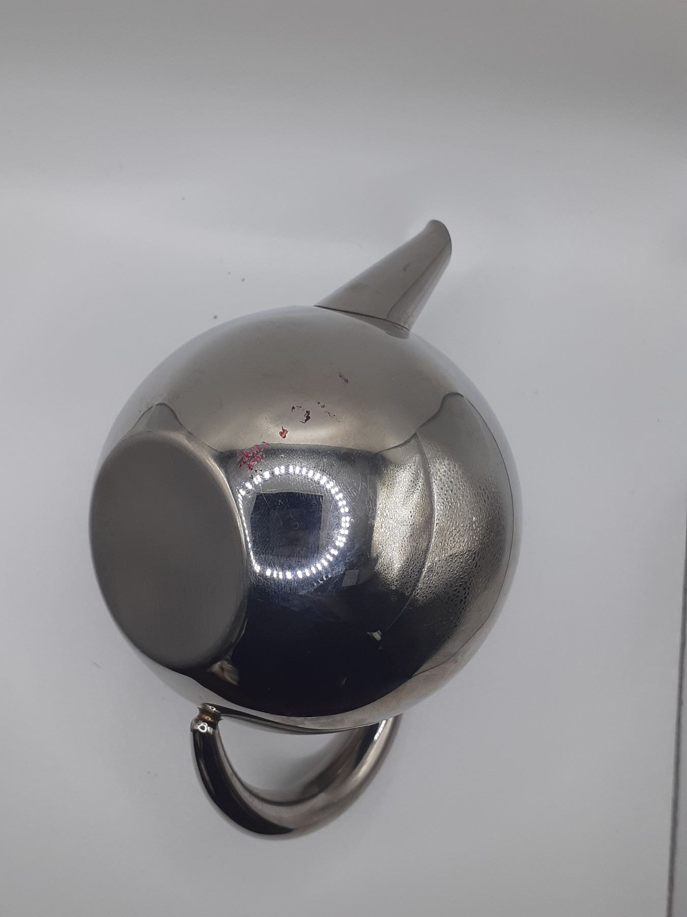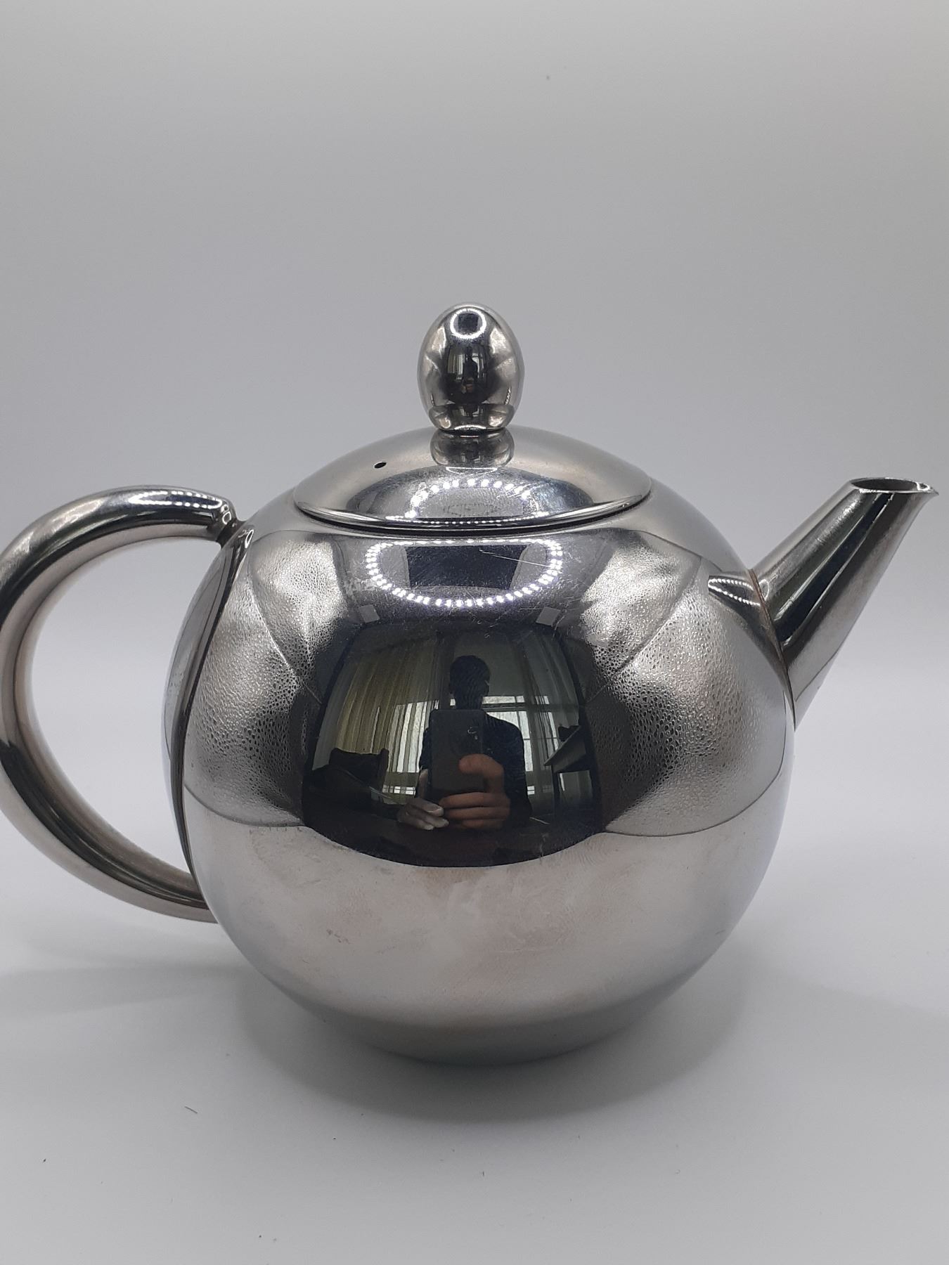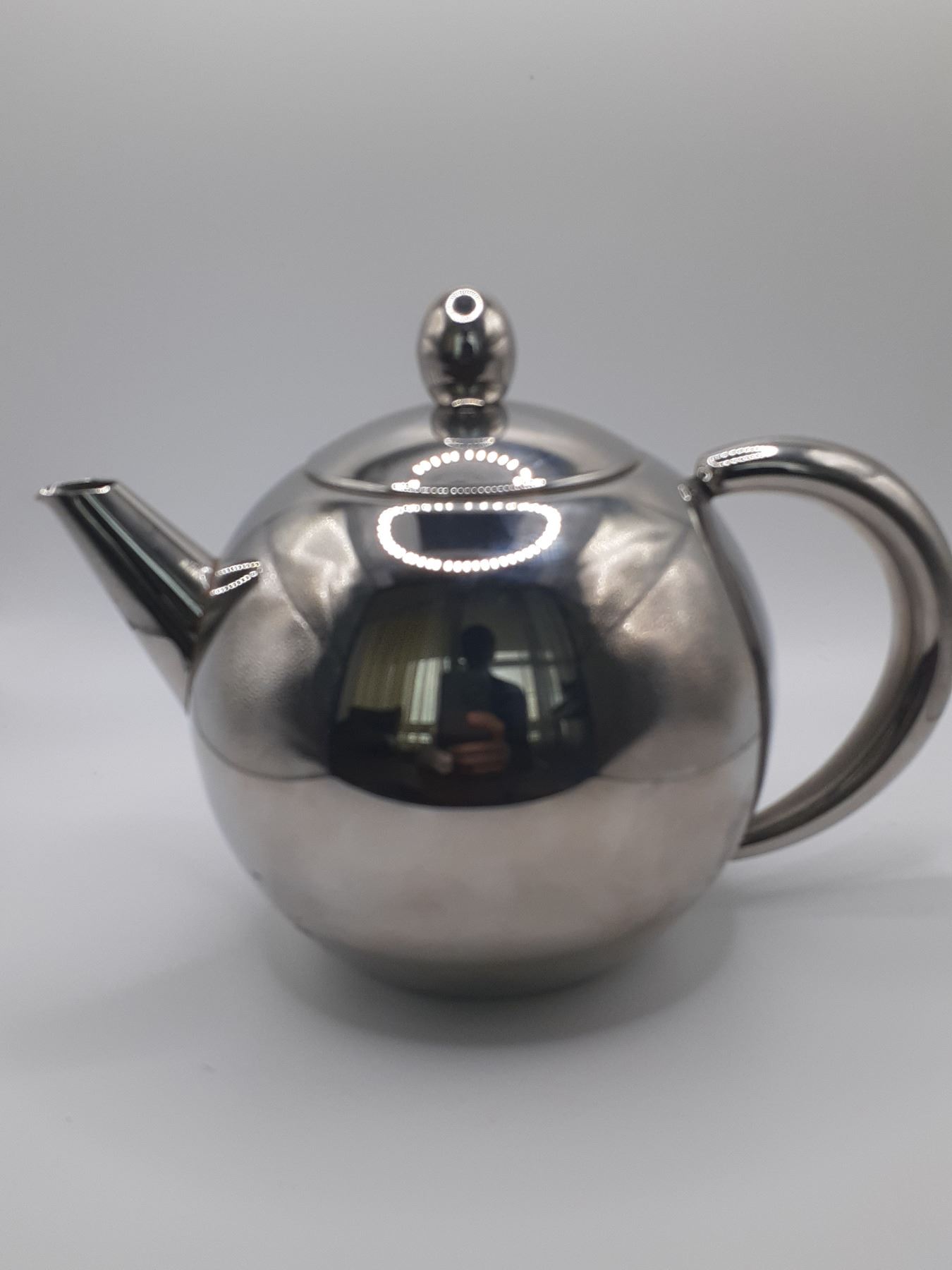 silver tone teapot, with filter, 4,1/4 tall and 3,5 diameter and almost 6 in wide including the handle