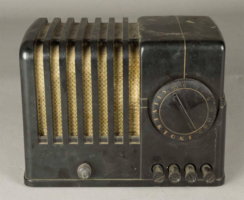 Tube radio in black Bakelite, four knobs, large tuning knob and on/off knob on lower left. 6.75" H x 9.5" W x 5.75" D. Unknown working condition. Original label on bottom, circa 1950's.