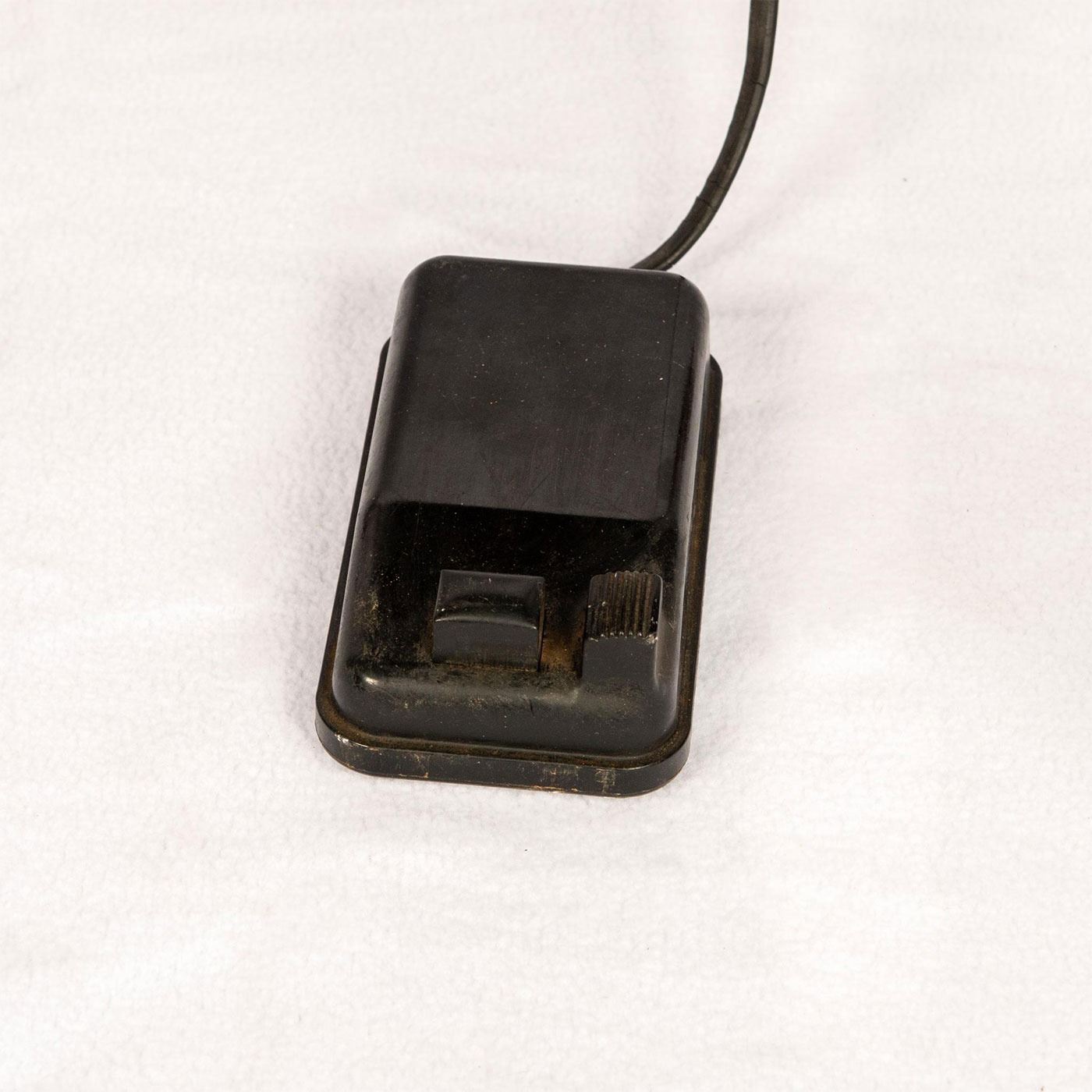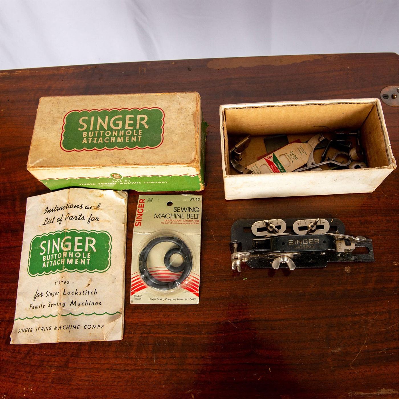 Black Singer AJ-66 sewing machine and original wooden sewing table. Singer Buttonhole Attachment 121795 and instructions included. Foot pedal, various spare parts, bobbins, and machine belts are included. Although at the time of this listing the unit appears to be in working order, Lion and Unicorn does not guarantee the working order of any mechanical pieces. Sewing machine dimensions: 16"L x 7"W x 9"H Sewing Table dimensions (open): 47.5"L x 17"W x 40"H Sewing Table dimensions (closed): 24"L x 17"W x 30.75"H #singer #sewingmachine