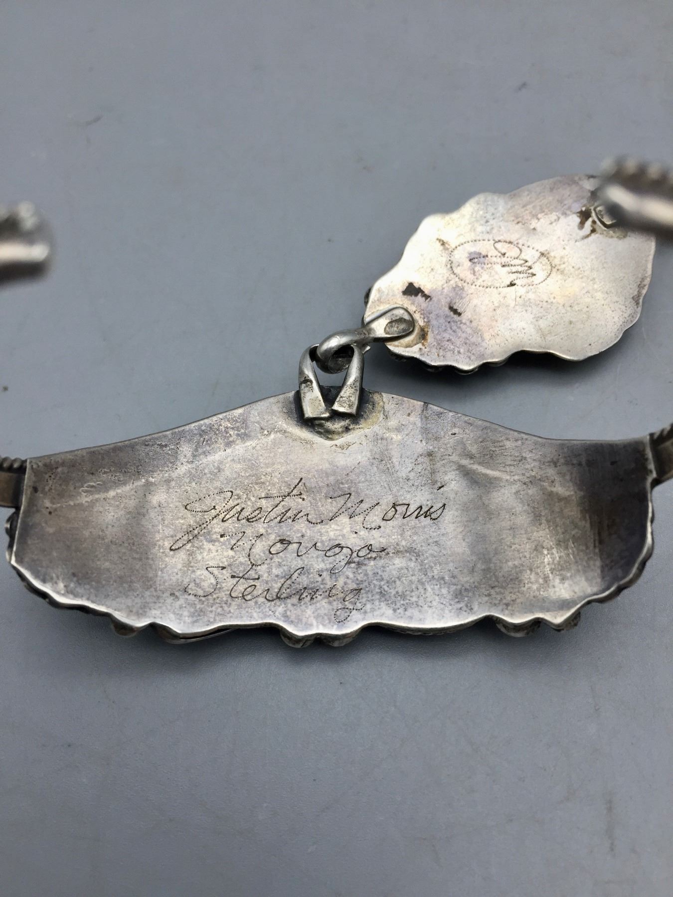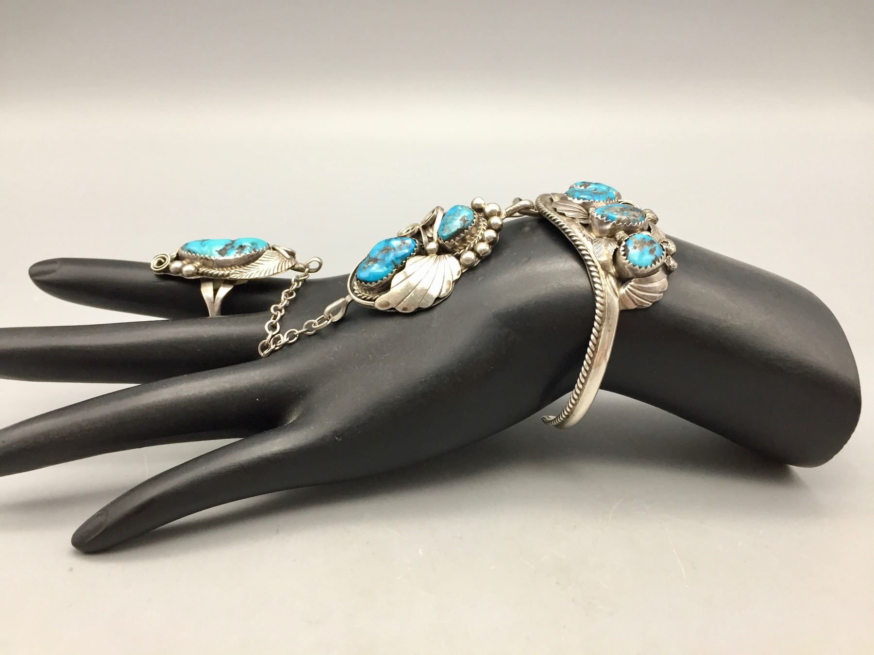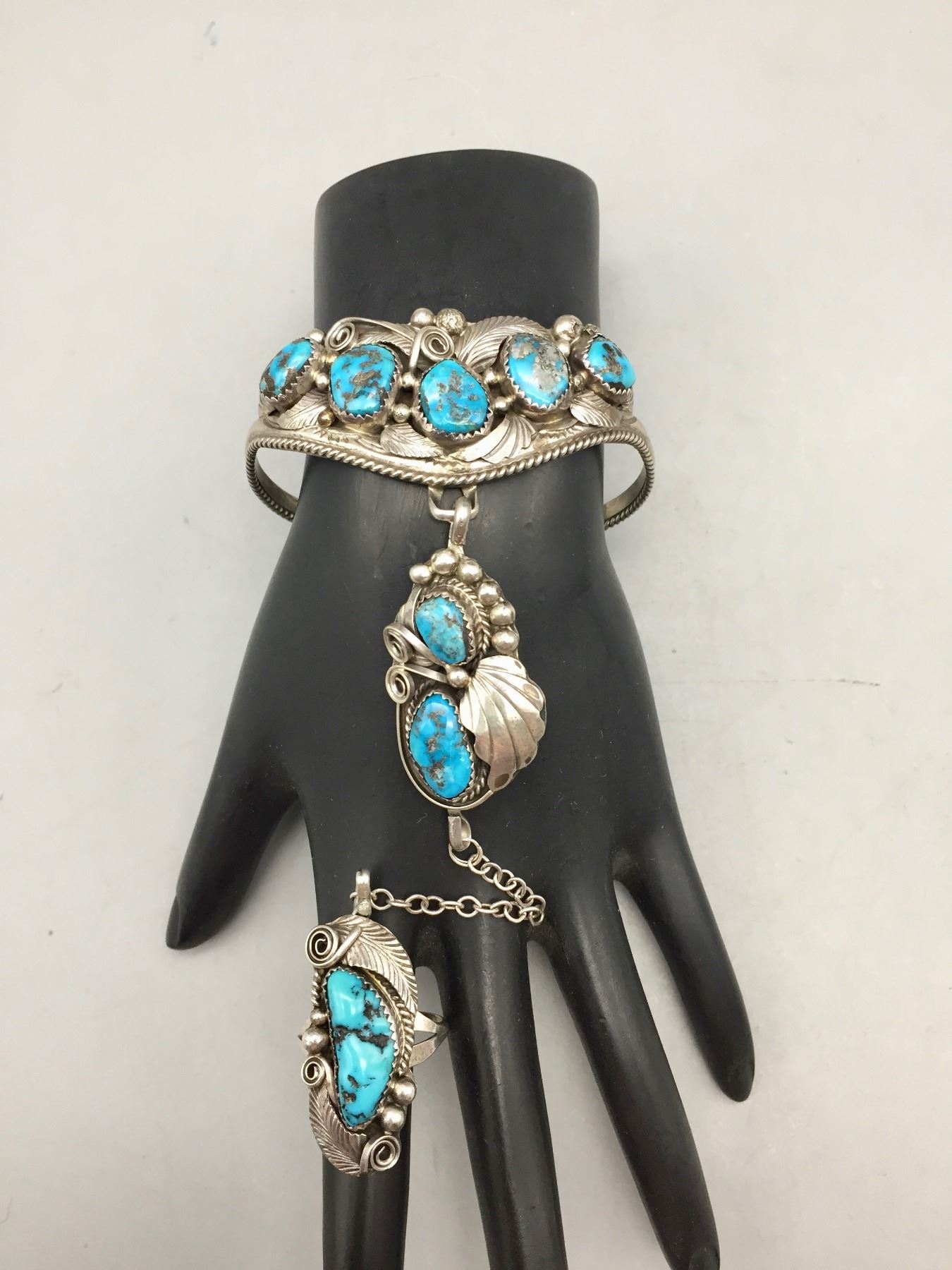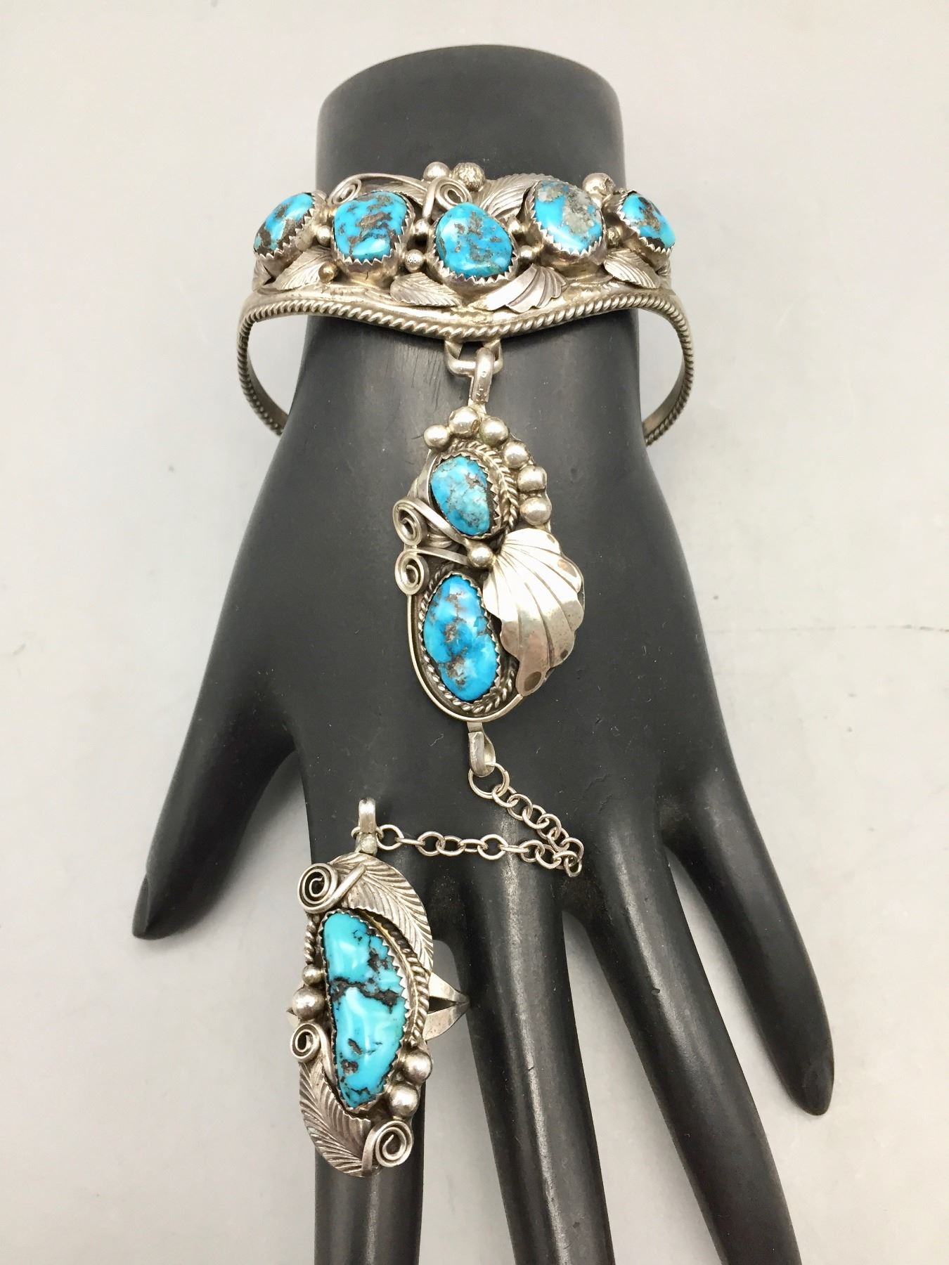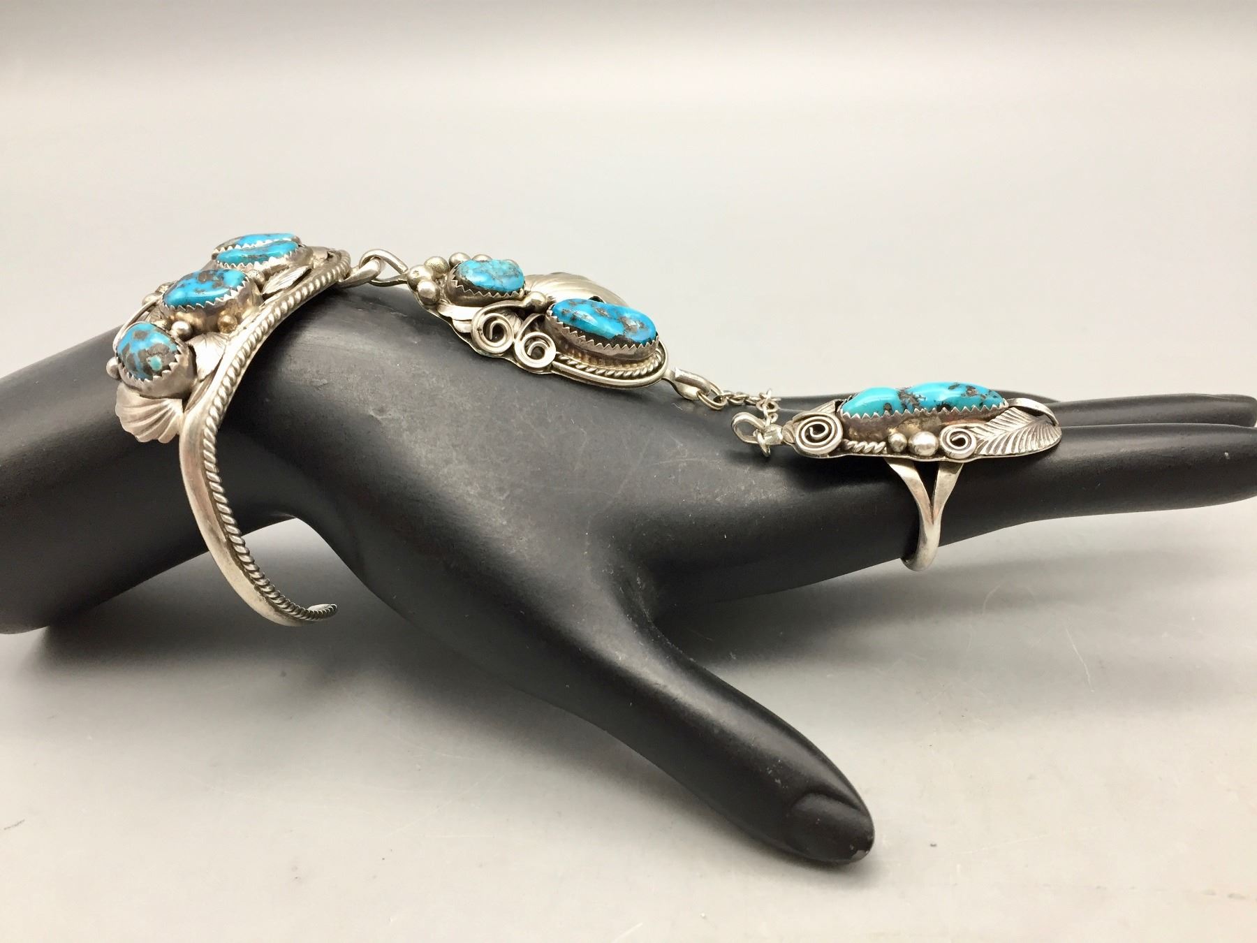 Description: For your bidding enjoyment we offer this vintage slave bracelet, featuring eight turquoise stones throughout the design as well as sterling silver appliqué. The term “slave bracelet” refers to a type of jewelry that has a chain or other attachment from the bracelet to one or more finger rings. This fashion originated in Africa and was likely adopted by Native Americans for tourist consumption after the bracelets became popular in the 1920s American culture. Maker: Marked, Justin Morris (Navajo). Approx. Age: Vintage. Size: Ring size is 8, cuff measures 5-5/8” with a 1-1/8” opening, (fits a 6-3/4” wrist). Weighs 40.5 grams. Condition: Good for its age, normal wear expected. Please look closely at the pictures - they are an important part of our description. Shipping: There will be a $5 handling / packaging fee for shipping this lot. The actual cost of postage will be added on top of that.
