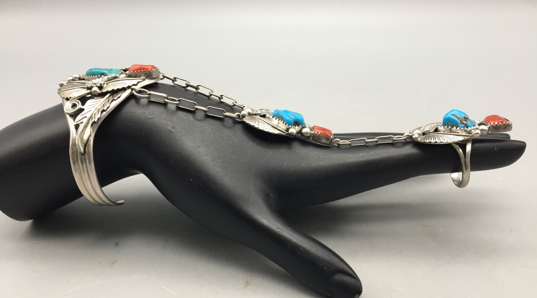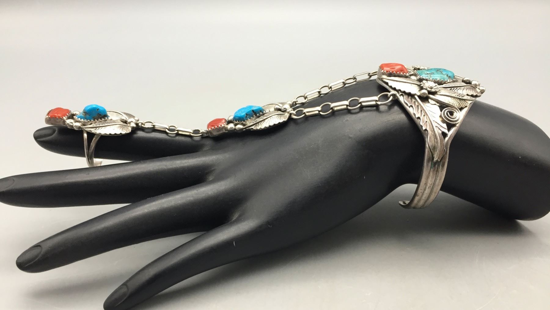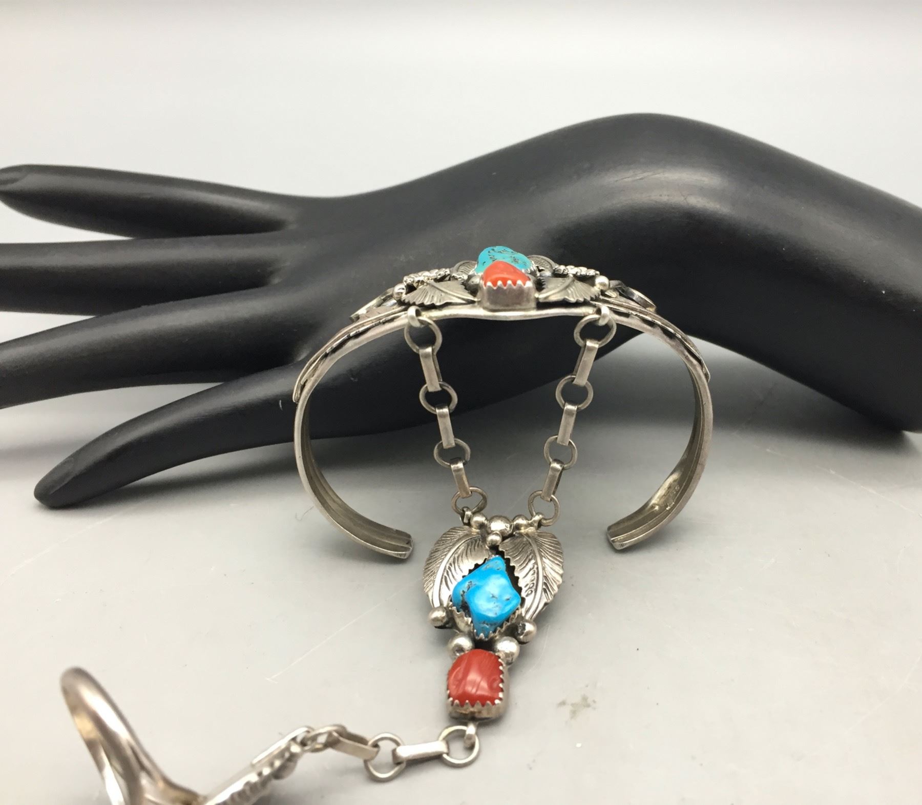 Description: Presented for sale in this lot is a vintage slave bracelet, set with turquoise and coral. It has lots of intricate floral silver appliqué. Stamped as sterling silver. Maker: Hallmarked with a partial stamp. Approx. Age: Vintage. Size: Bracelet measures 5-1/8â€. Opening is an additional 1-1/4â€, fitting a 6-3/8†wrist. Width is 1-5/8â€. Ring is a size 7. Weighs 39.4 grams. Condition: Good for its age, normal wear expected. Please look closely at the pictures - they are an important part of our description. Shipping: There will be a $5 handling / packaging fee for shipping this lot. The actual cost of postage will be added on top of that.