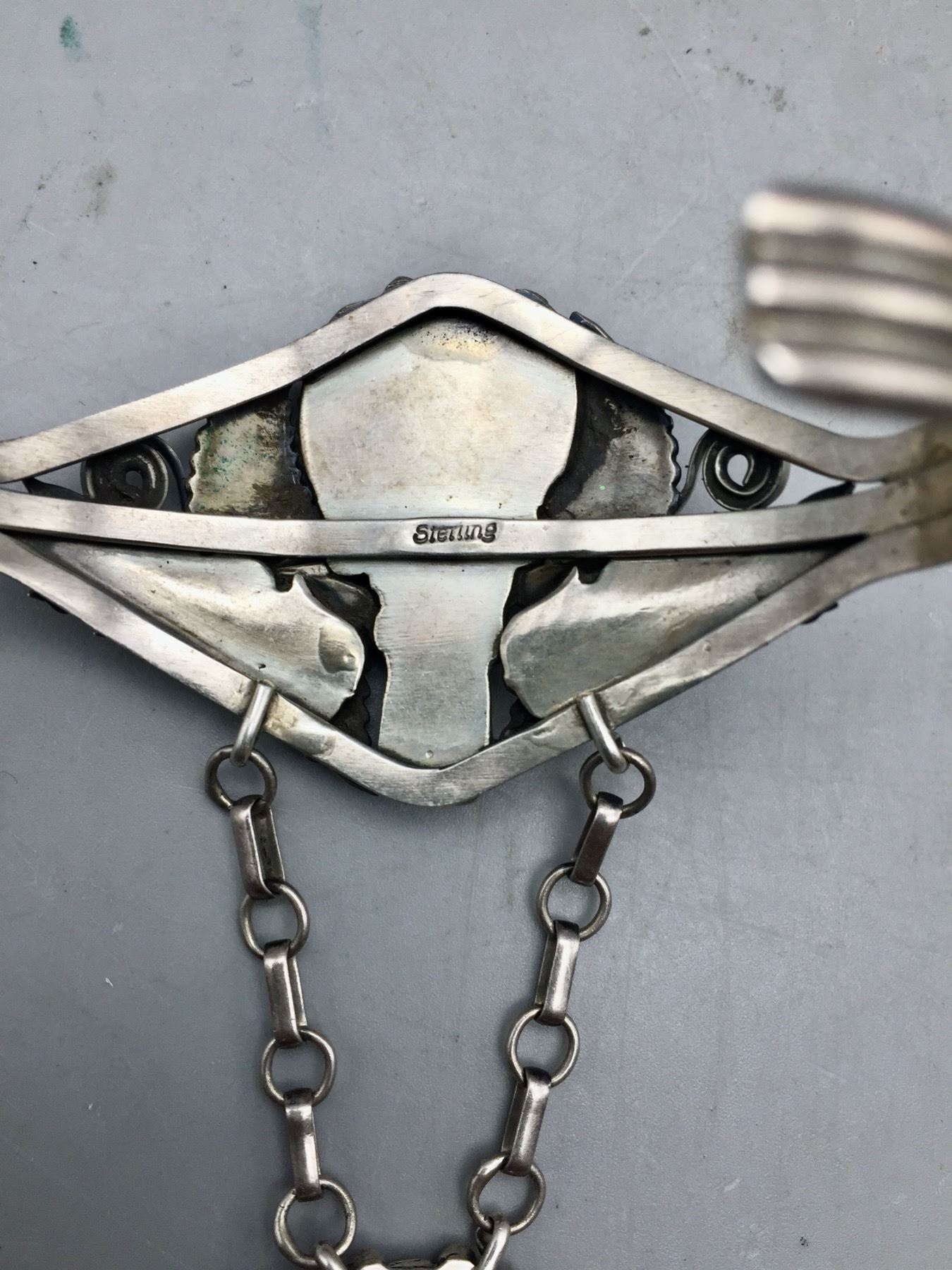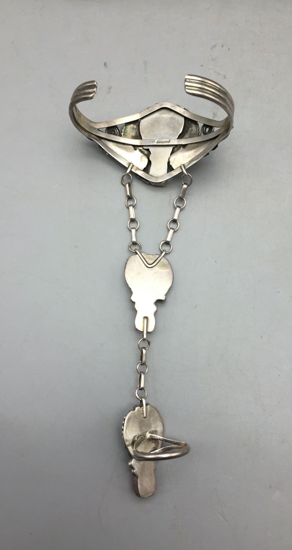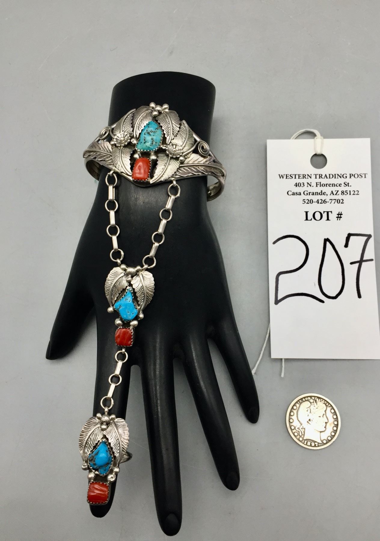 Description: Presented for sale in this lot is a vintage slave bracelet, set with turquoise and coral. It has lots of intricate floral silver appliqué. Stamped as sterling silver. Maker: Hallmarked with a partial stamp. Approx. Age: Vintage. Size: Bracelet measures 5-1/8â€. Opening is an additional 1-1/4â€, fitting a 6-3/8†wrist. Width is 1-5/8â€. Ring is a size 7. Weighs 39.4 grams. Condition: Good for its age, normal wear expected. Please look closely at the pictures - they are an important part of our description. Shipping: There will be a $5 handling / packaging fee for shipping this lot. The actual cost of postage will be added on top of that.