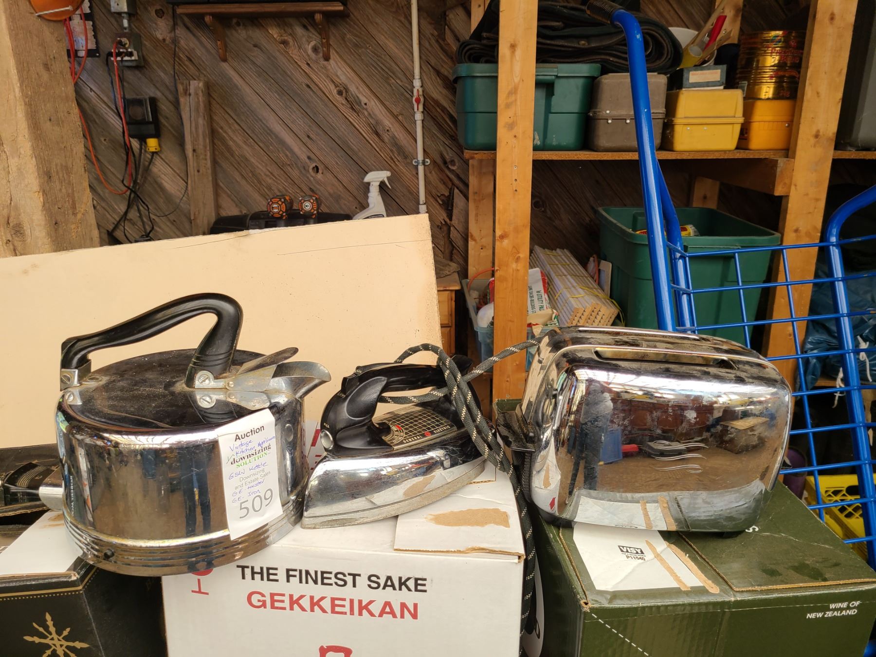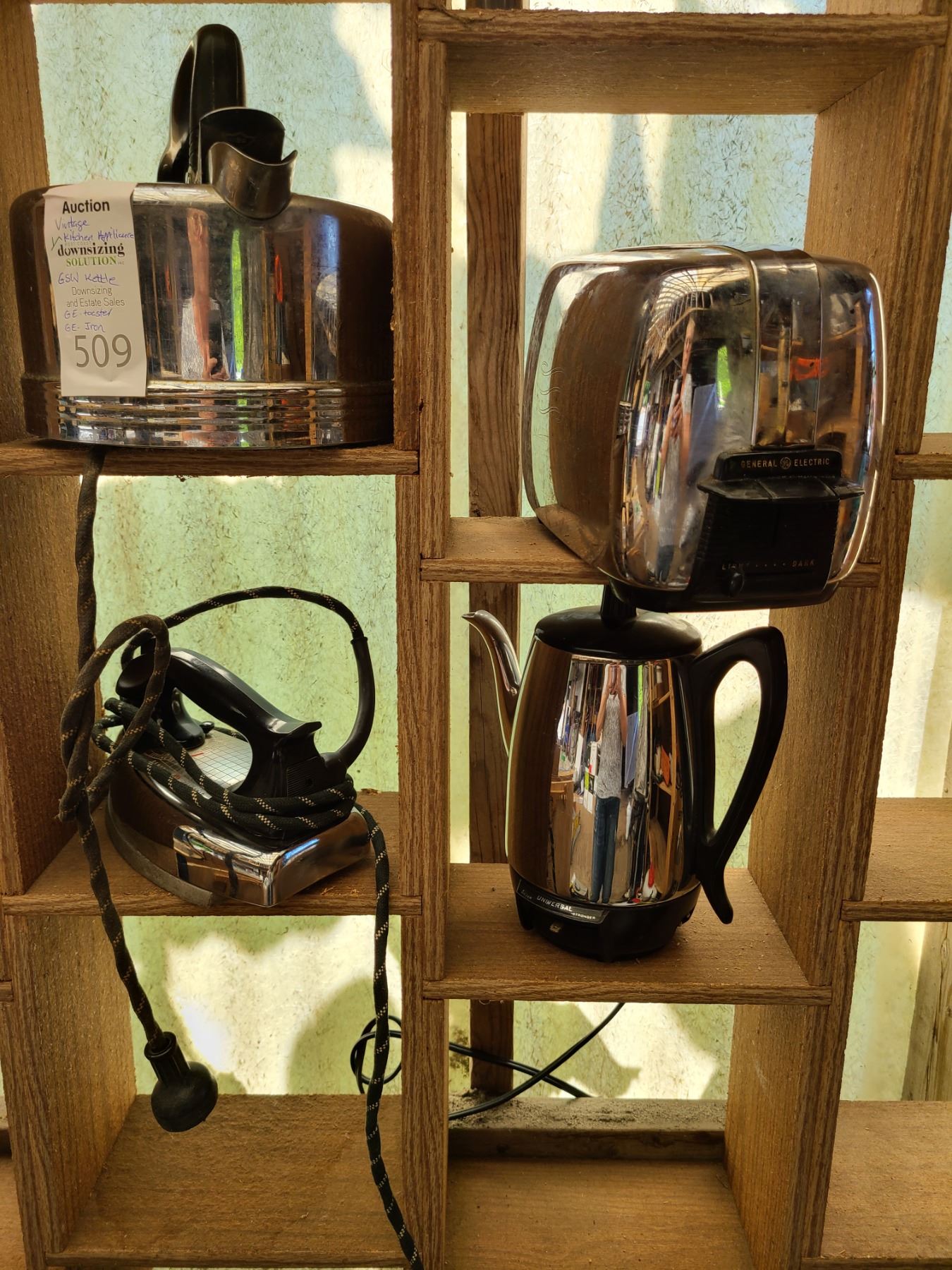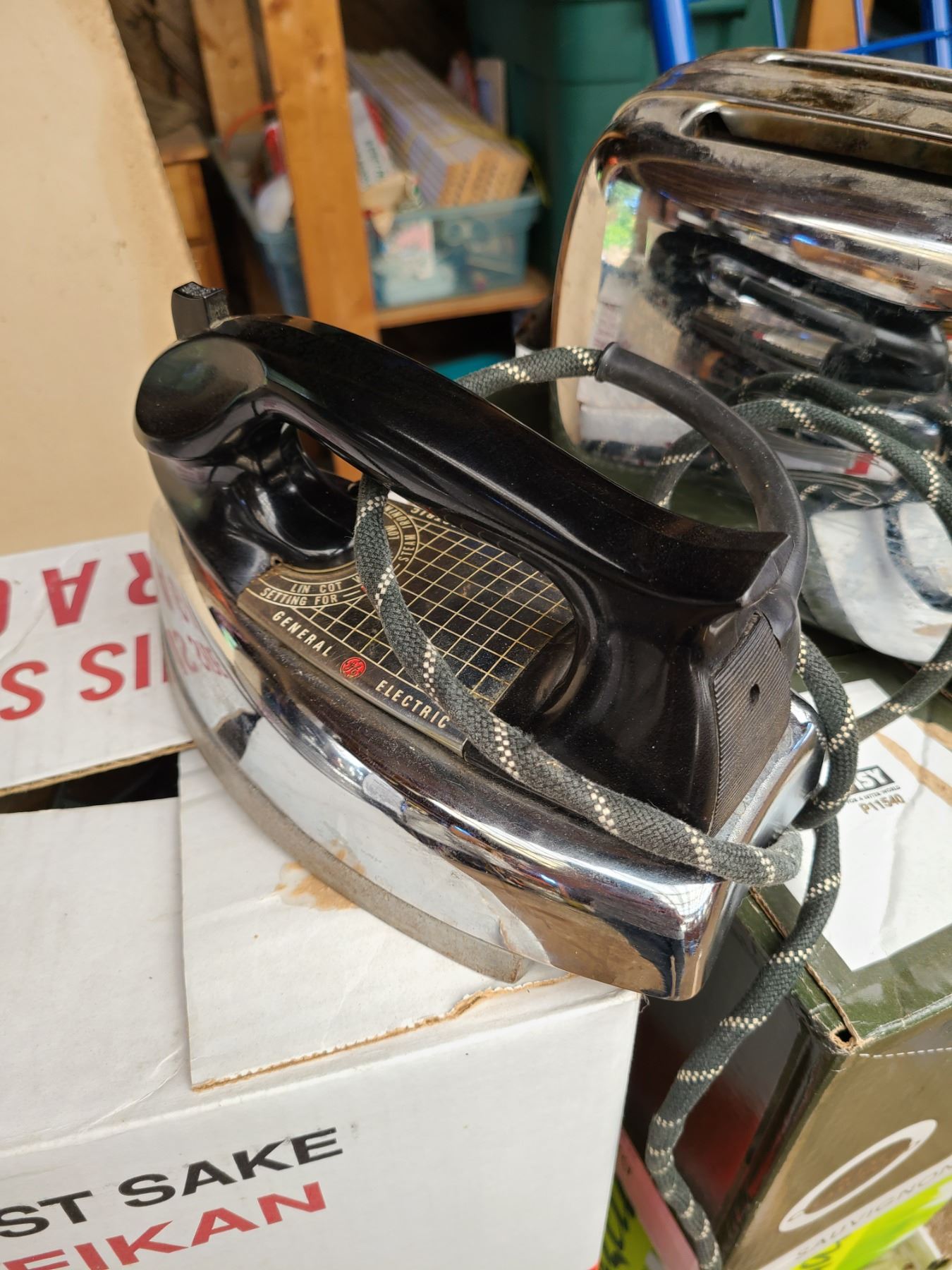 M-36312. GE toaster, GE iron, GSW electric kettle, Universal kettle missing cord. All untested. Pickup at 10am