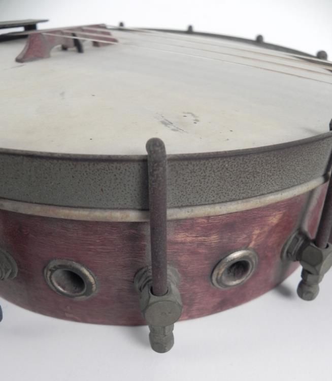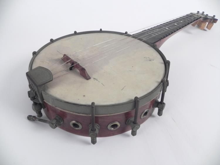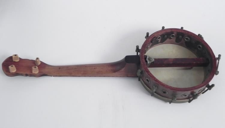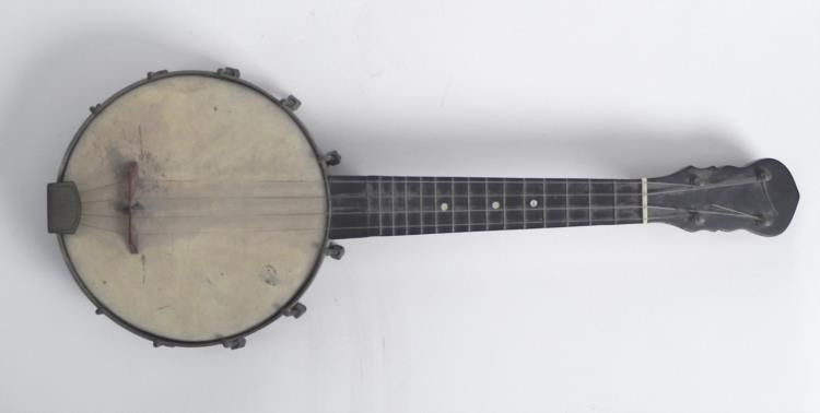 This vintage banjo is small, measuring 22" end to end, and 8" in diameter. There are no maker marks, but it is certainly an older model. The body is wood, with ivory tone tuning pegs. The strings are plastic. The head has some smudges, a