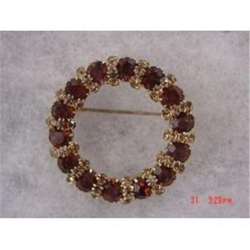 Here is a wonderful smokey topaz amber color rhinestone circular brooch. There are larger topaz color stones that are all hand set and held firmly intact by prongs, in between the larger ones are 4 smaller ones. They are also held in tact by individual prongs. All stones appear original, sparkling and intact. Excellent condition