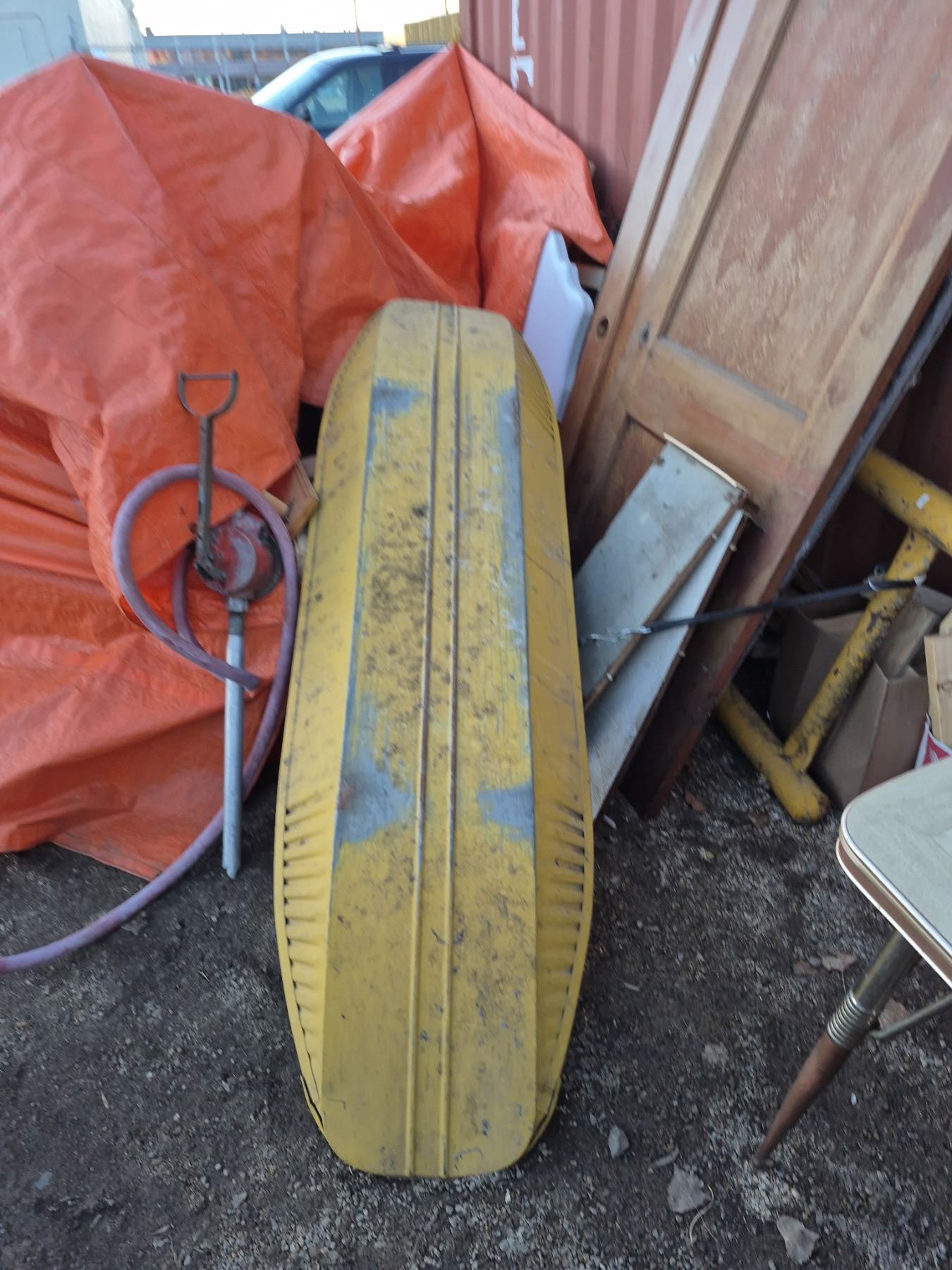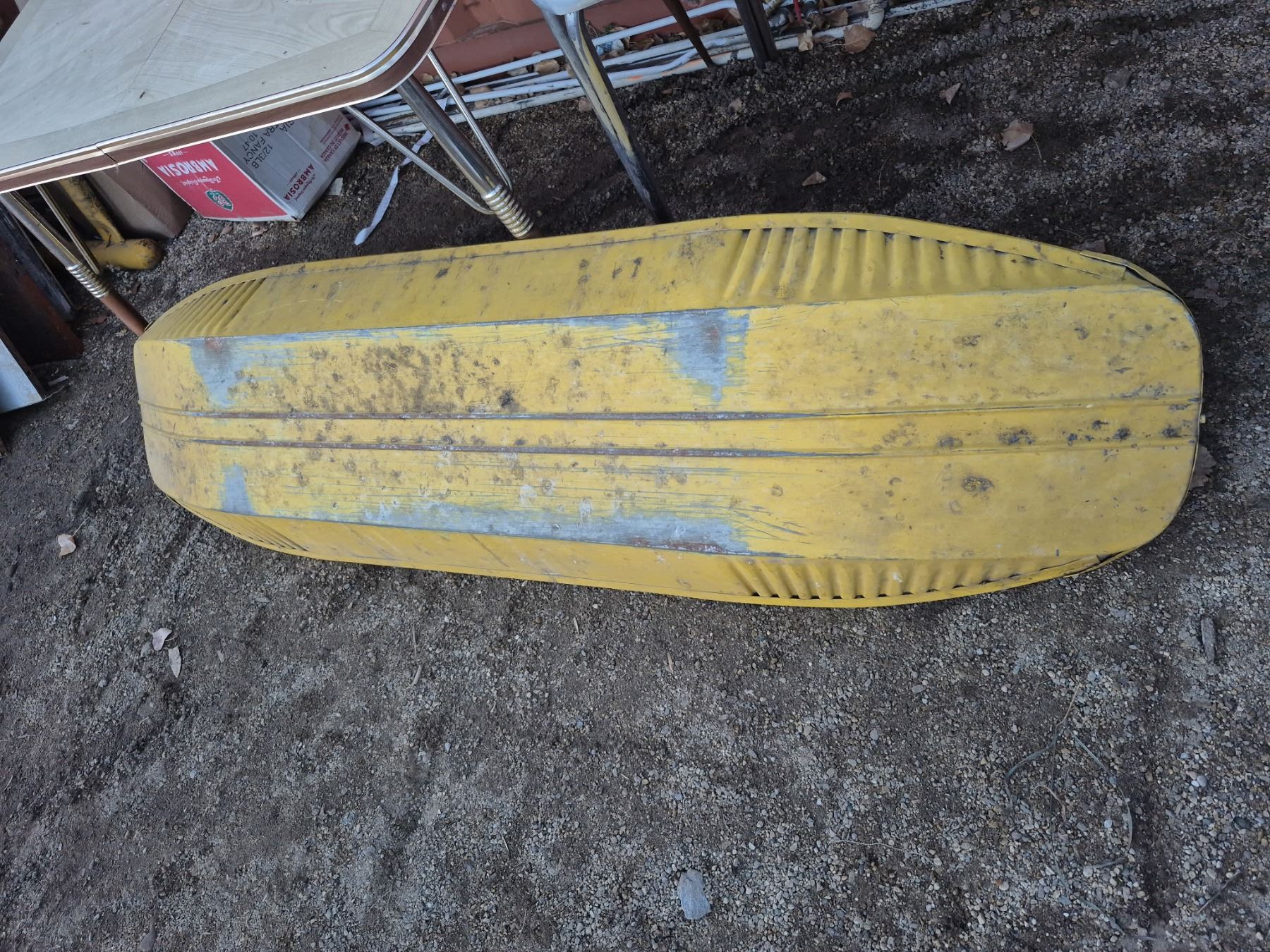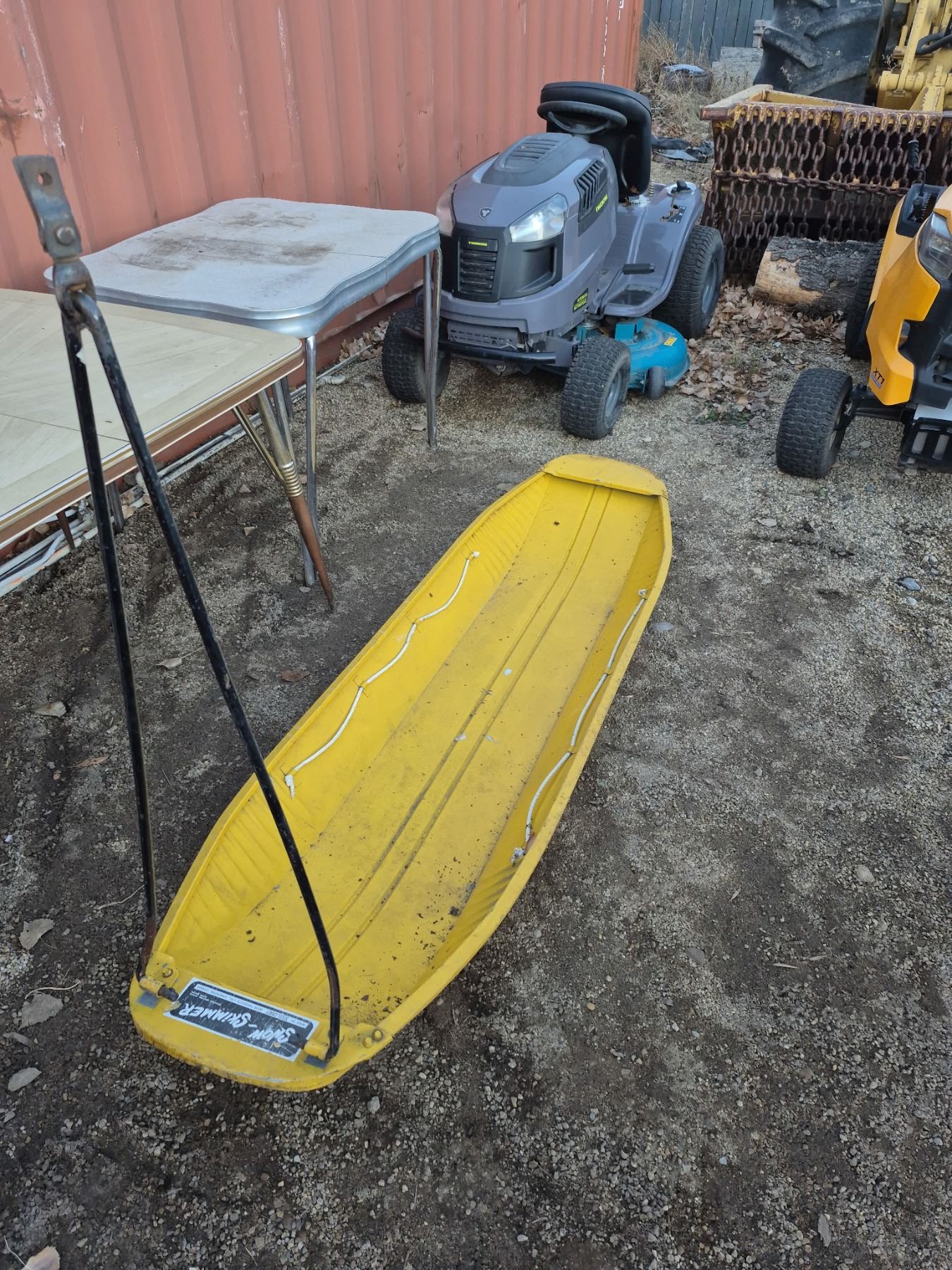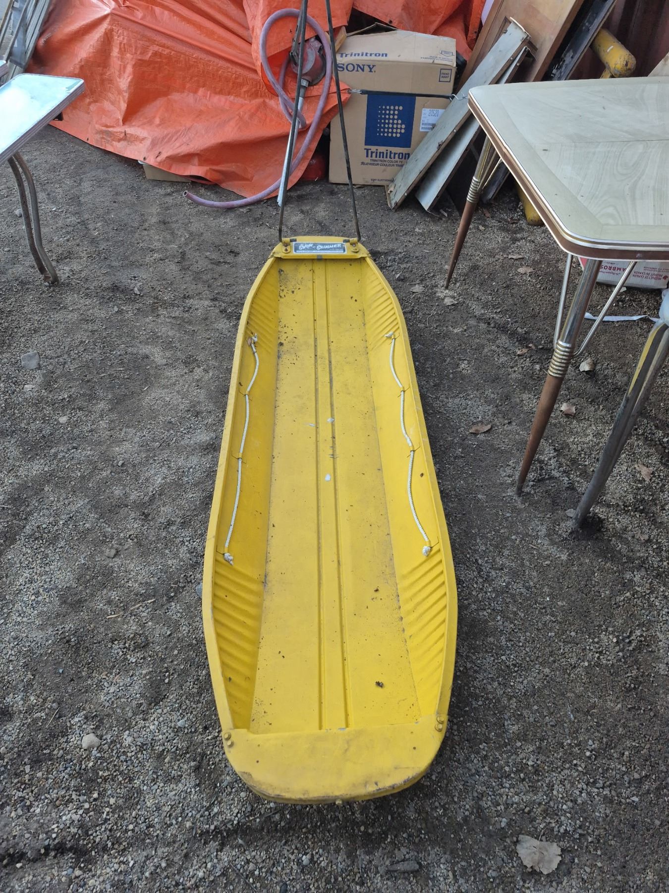 This vintage yellow Snow Skimmer sled is a classic lightweight pull-style model with metal tow bars and original rope lines. Made from durable metal, it features a long, streamlined design ideal for towing behind or guiding by hand. The sled shows general wear from age and outdoor use, including surface dirt and scuffs, but remains a great retro winter piece for display, décor, or use at your own discretion.