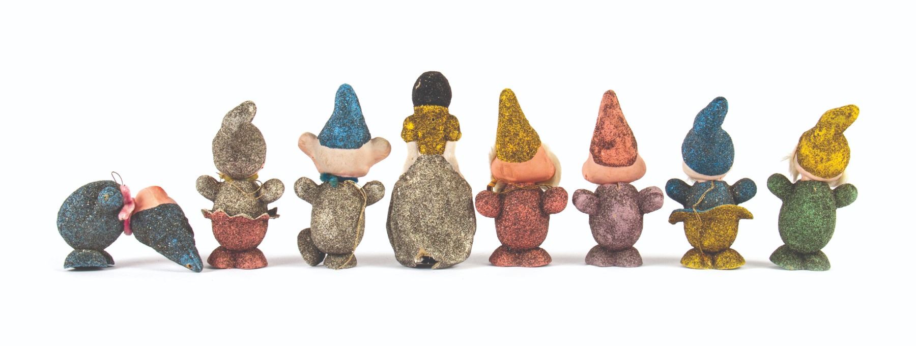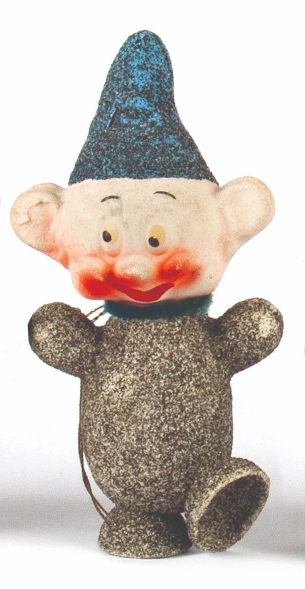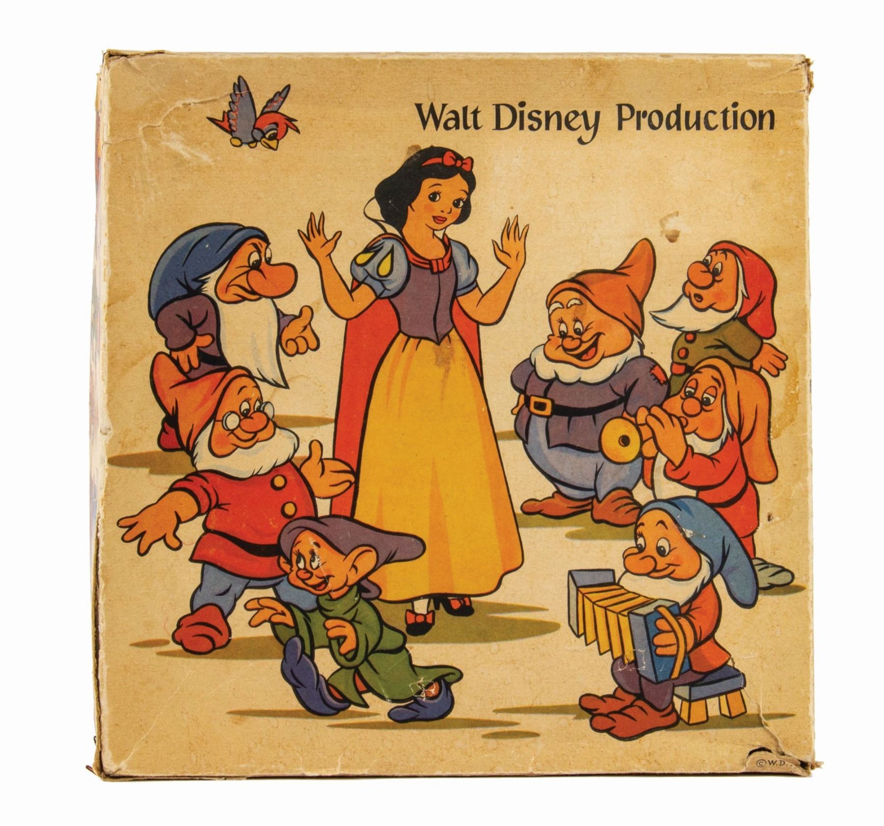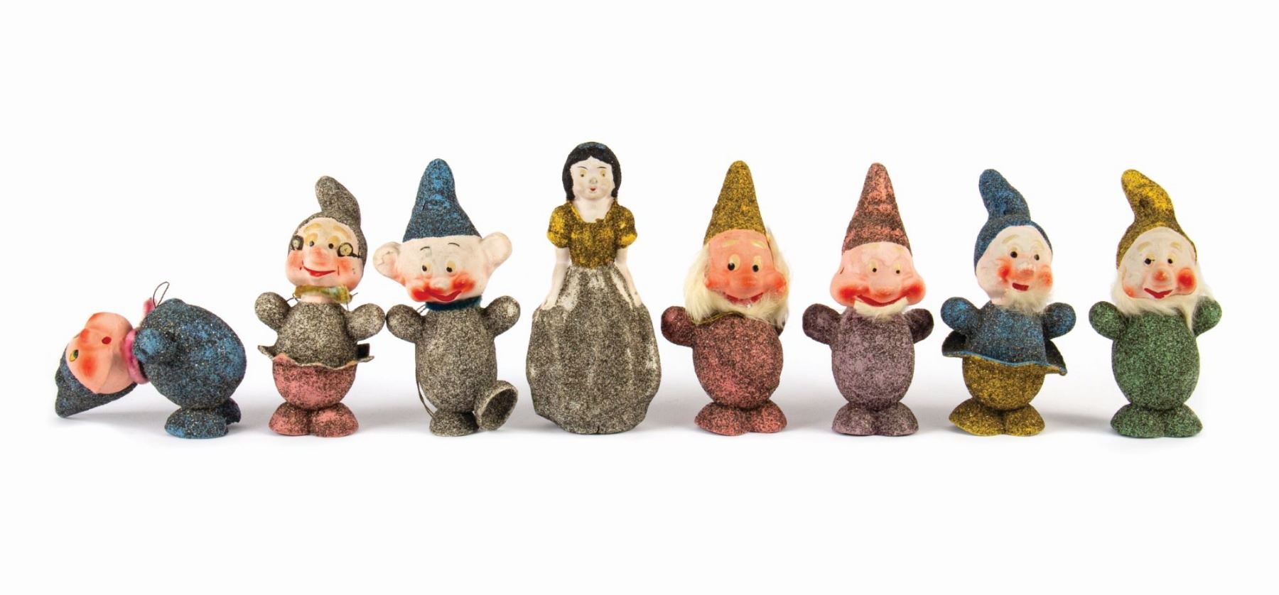 (Walt Disney studios, 1938) A full set of (8) ornaments from Walt Disney's Snow White and the Seven Dwarfs, created in Germany shortly after the release of the animated film. These ornaments were designed to hide candy inside, accessed by removing the heads of the dwarfs. The figures were created with papier-mache and mica, with rabbit fur beards on 3 of the ornaments. Snow White measures 6" tall, while the dwarfs measure approximately 5.5" tall. The set is in the original box measuring 10"x10" and 2" deep, with expected wear to the box from age. The ornaments are in overall fair to good condition, with some cracks and dents, and a small 0.5" piece broken on the back of Snow White's dress.