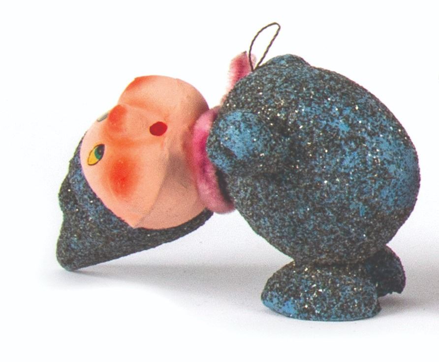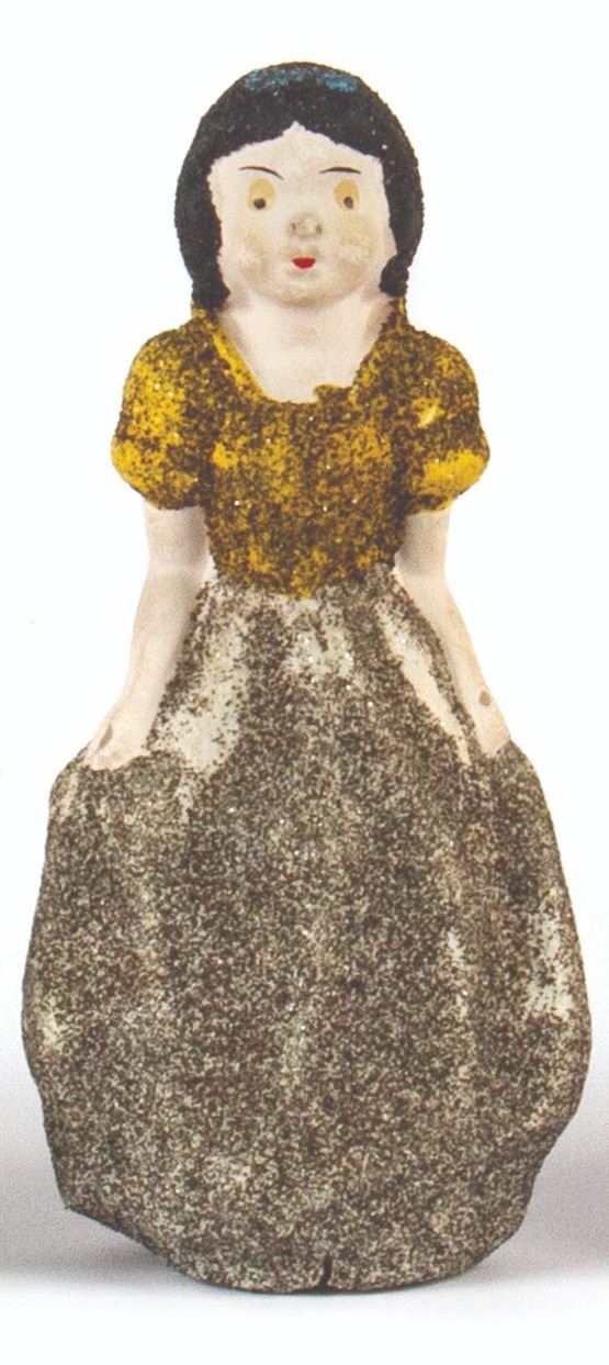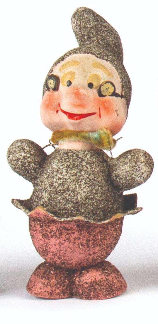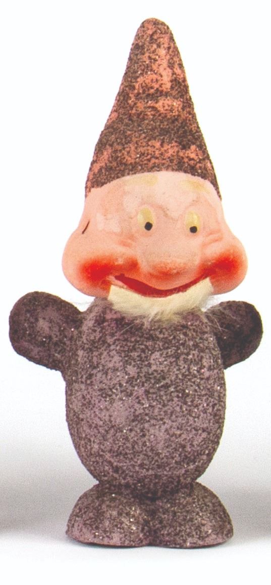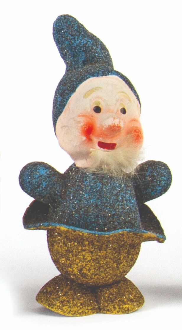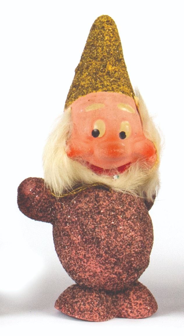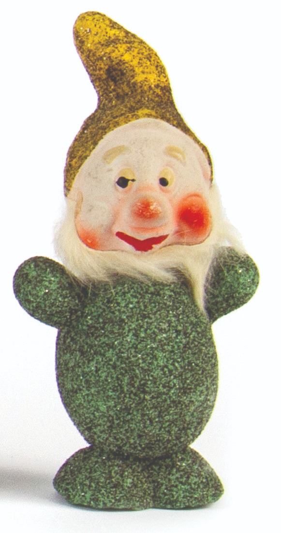 (Walt Disney studios, 1938) A full set of (8) ornaments from Walt Disney's Snow White and the Seven Dwarfs, created in Germany shortly after the release of the animated film. These ornaments were designed to hide candy inside, accessed by removing the heads of the dwarfs. The figures were created with papier-mache and mica, with rabbit fur beards on 3 of the ornaments. Snow White measures 6" tall, while the dwarfs measure approximately 5.5" tall. The set is in the original box measuring 10"x10" and 2" deep, with expected wear to the box from age. The ornaments are in overall fair to good condition, with some cracks and dents, and a small 0.5" piece broken on the back of Snow White's dress.