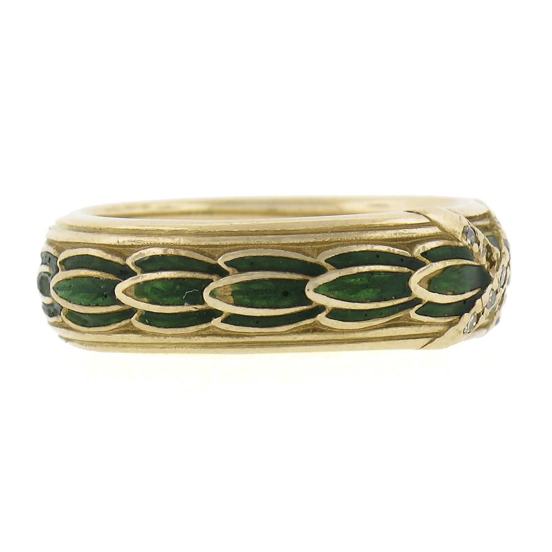 A vintage solid 14k yellow gold band ring, with green enamel work & 9 round cut natural diamonds (G/H - VS2/SI1 ; 0.09ctw). The ring is size 7.0, weighs a total of 7.30 grams, and measures 6.8mm wide.