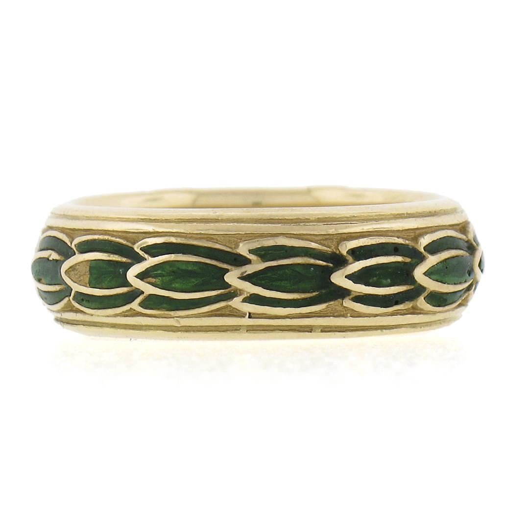 A vintage solid 14k yellow gold band ring, with green enamel work & 9 round cut natural diamonds (G/H - VS2/SI1 ; 0.09ctw). The ring is size 7.0, weighs a total of 7.30 grams, and measures 6.8mm wide.
