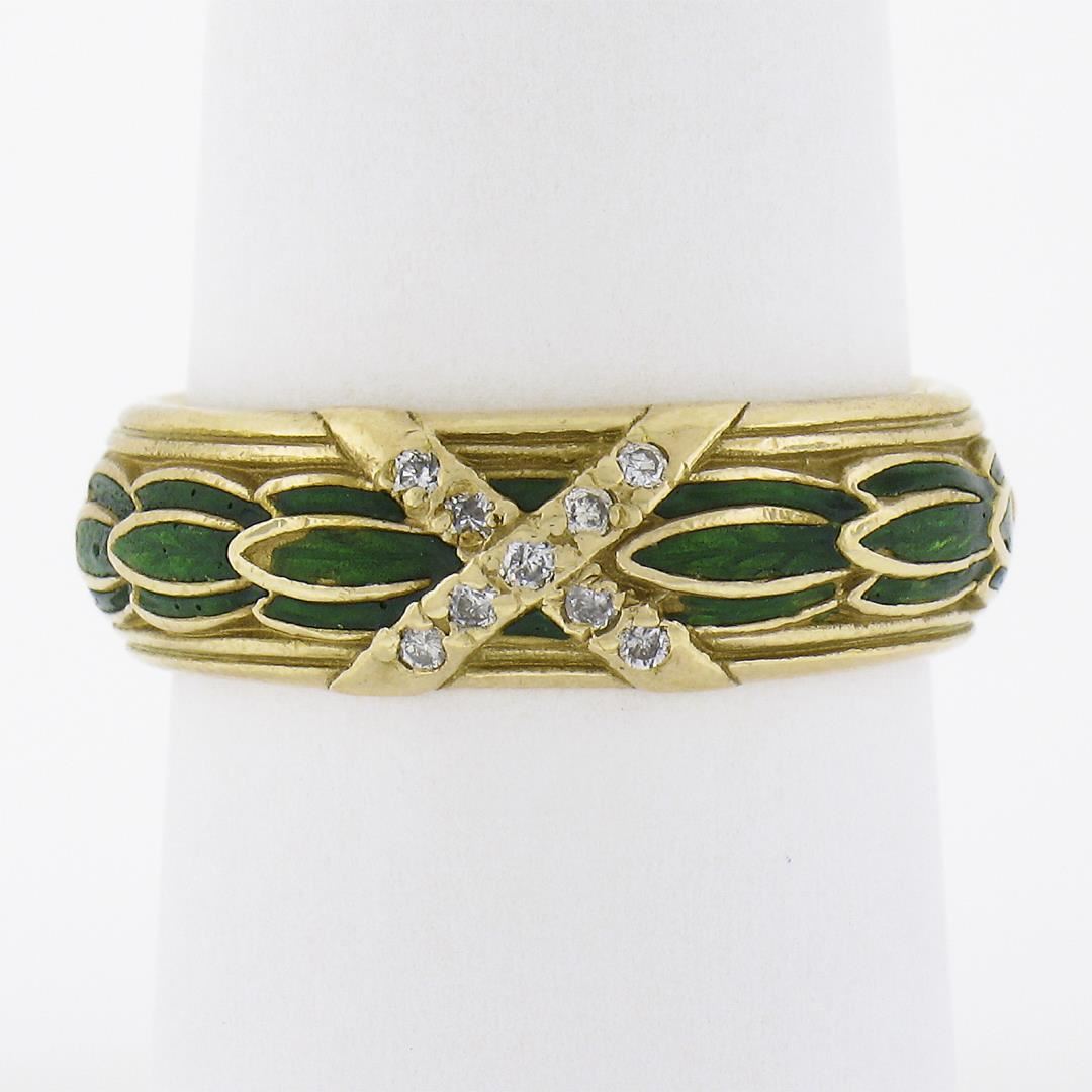 A vintage solid 14k yellow gold band ring, with green enamel work & 9 round cut natural diamonds (G/H - VS2/SI1 ; 0.09ctw). The ring is size 7.0, weighs a total of 7.30 grams, and measures 6.8mm wide.
