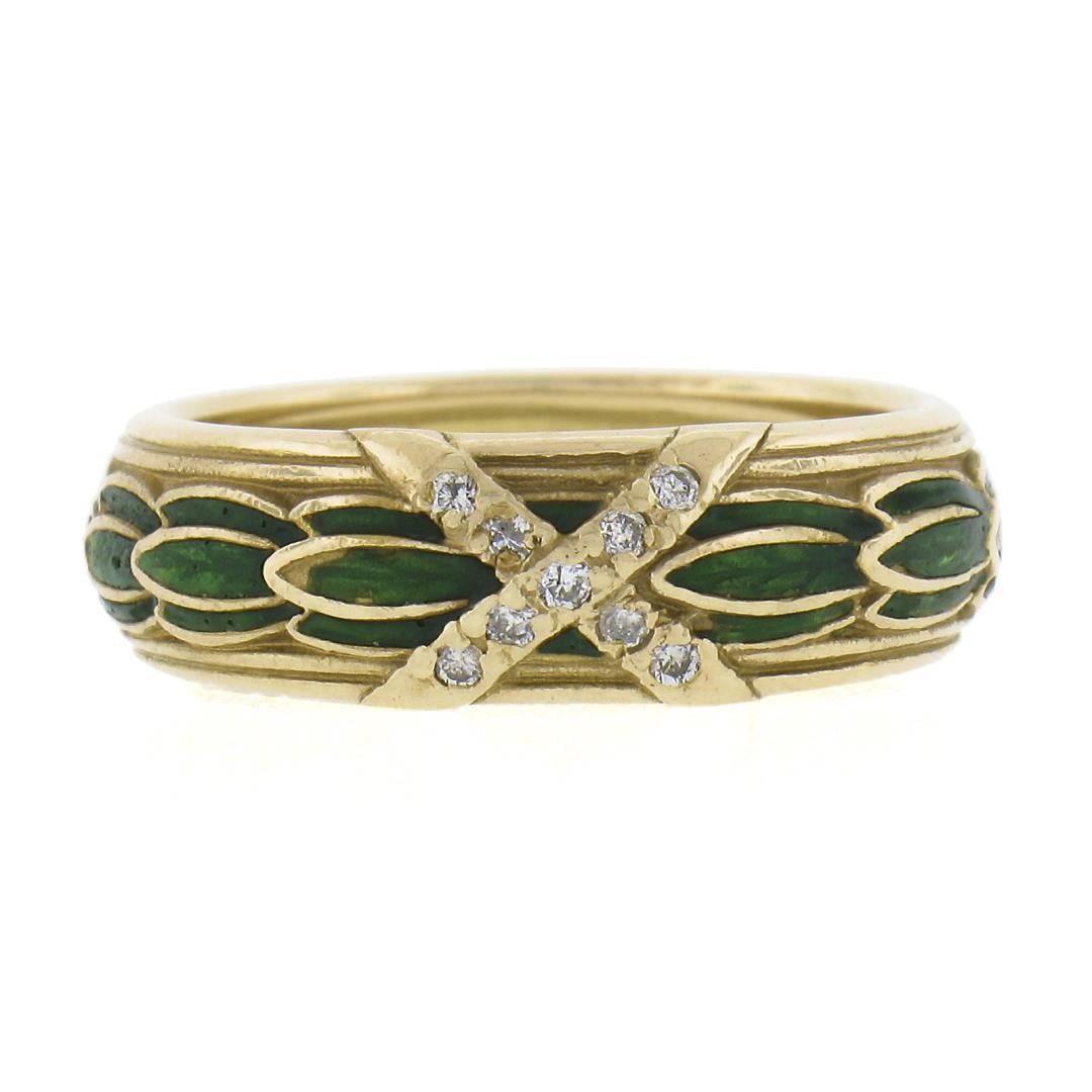 A vintage solid 14k yellow gold band ring, with green enamel work & 9 round cut natural diamonds (G/H - VS2/SI1 ; 0.09ctw). The ring is size 7.0, weighs a total of 7.30 grams, and measures 6.8mm wide.