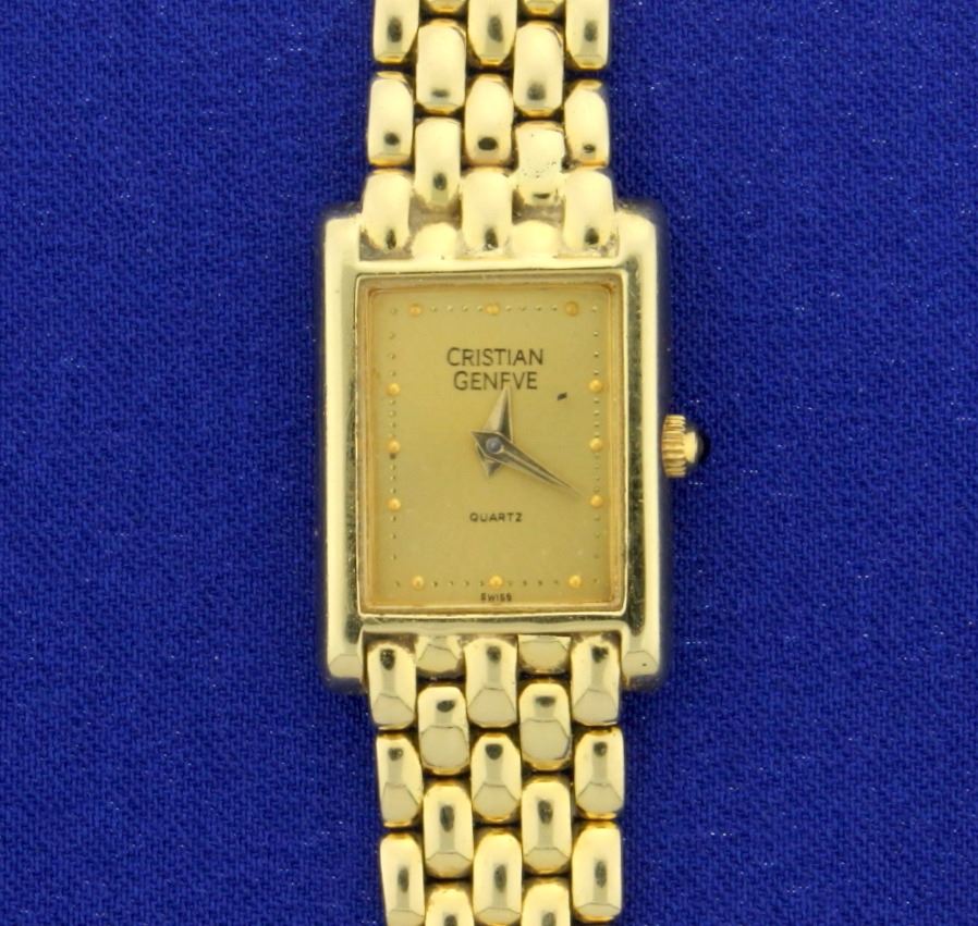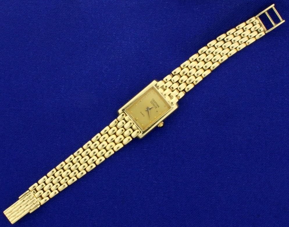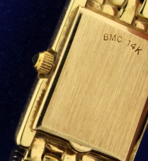 In solid 14k yellow gold, Swiss made quartz movement runs great. Beautiful natural Ruby on crown. 6 1/8 inches long. 30.0g.