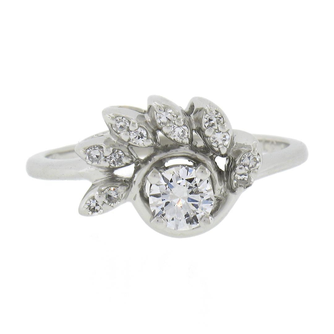 Vintage Solid 14k White Gold 0.45ctw Round Solitaire Diamond w/ Flame Ring