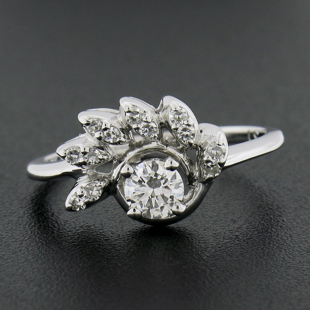 Vintage Solid 14k White Gold 0.45ctw Round Solitaire Diamond w/ Flame Ring
