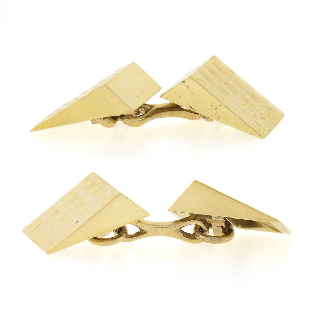 A vintage soldi 14k yellow gold pyramid cufflinks. These cuff links have a chain design with a clearance of 16.8mm, weigh a total of 9.13 grams, and the front panels measure 10.9x13.2mm.