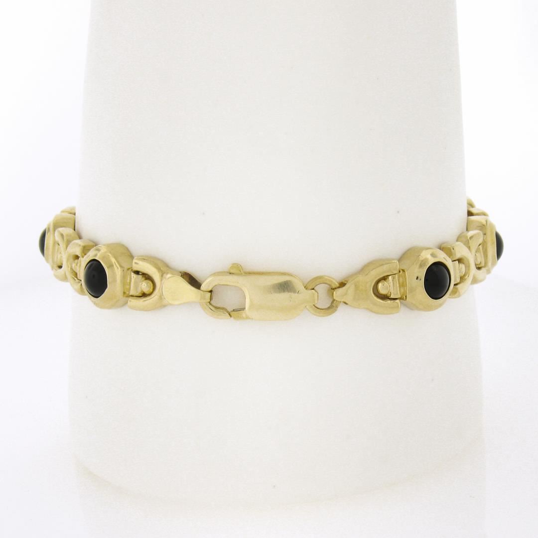 A vintage solid 14k yellow gold link bracelet, with 8 round cut natural black onyx (5mm each). It weighs a total of 19.5 grams, measures 8.7mm wide, and measures 7 inches in length.