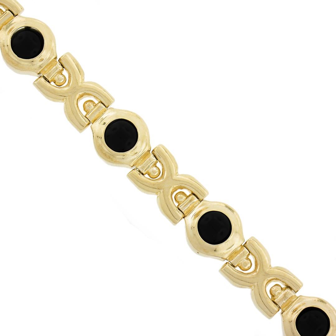 A vintage solid 14k yellow gold link bracelet, with 8 round cut natural black onyx (5mm each). It weighs a total of 19.5 grams, measures 8.7mm wide, and measures 7 inches in length.