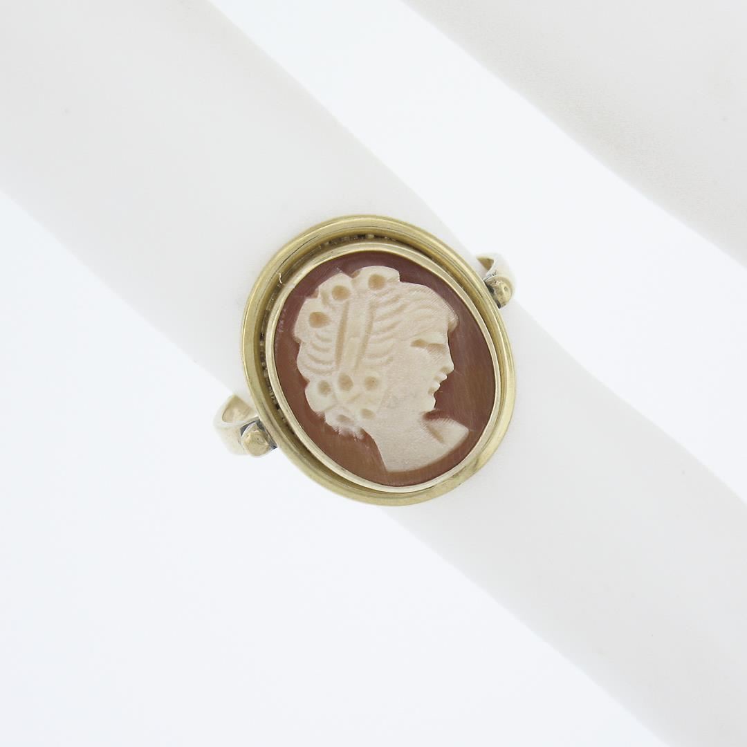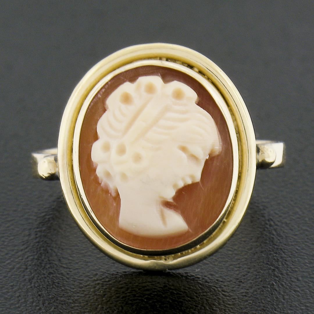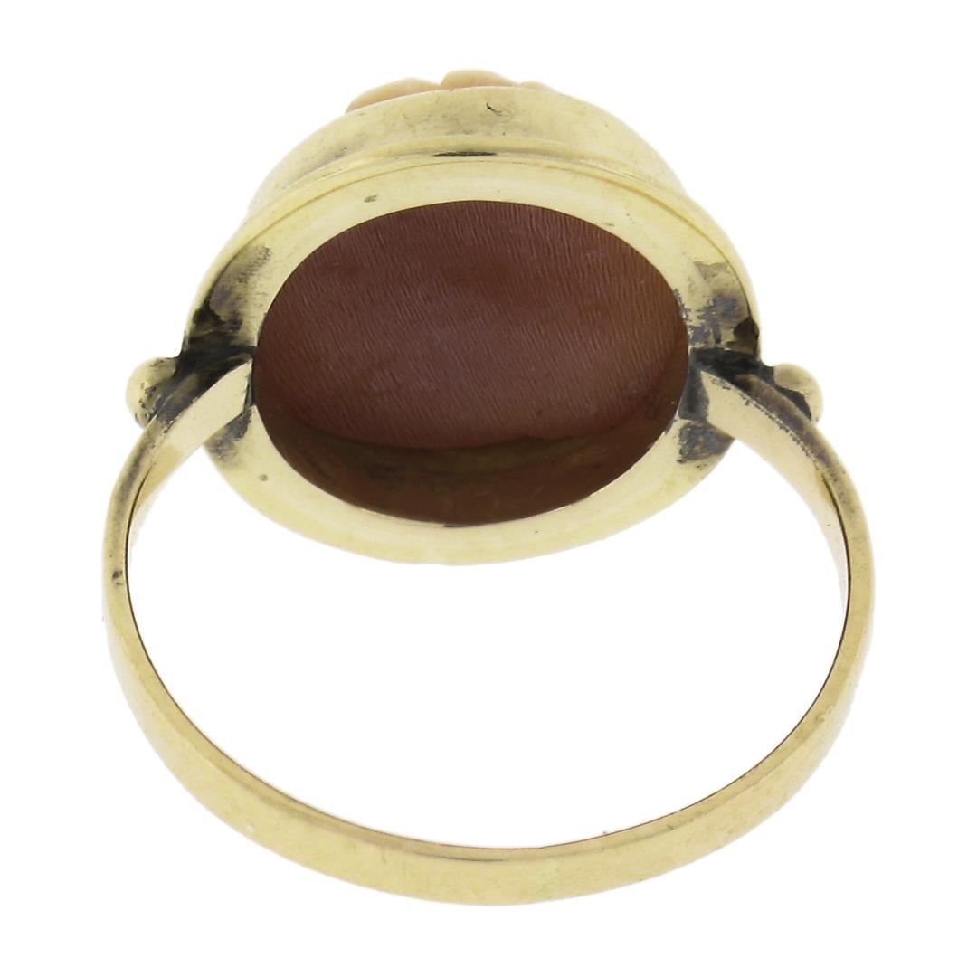 A vintage solid 18k yellow gold ring, with 1 oval carved cameo natural shell (11.6x9.8mm). The ring is size 3.5, weighs a total of 2.16 grams, and measures 14.5mm wide.