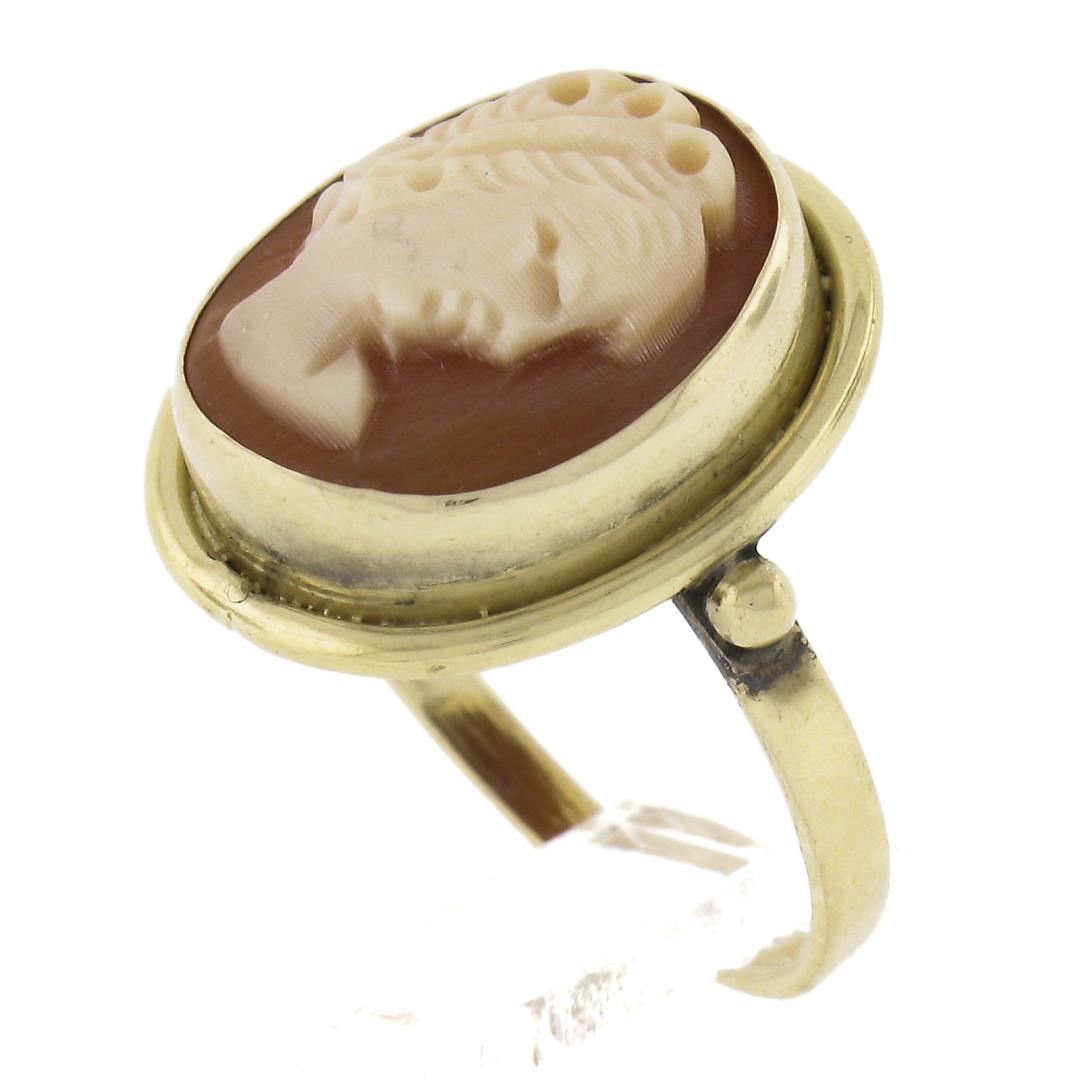 A vintage solid 18k yellow gold ring, with 1 oval carved cameo natural shell (11.6x9.8mm). The ring is size 3.5, weighs a total of 2.16 grams, and measures 14.5mm wide.
