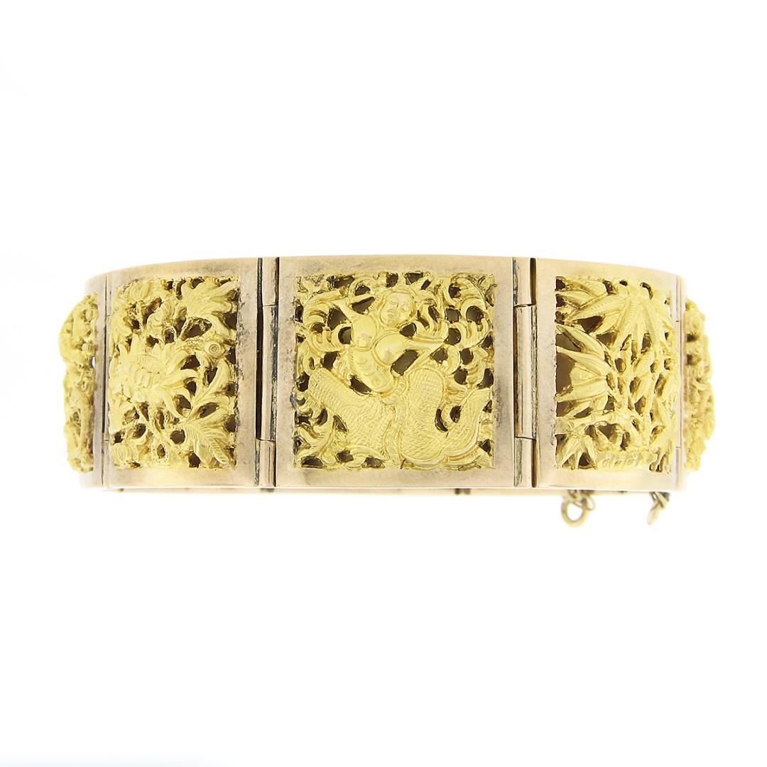 A vintage solid 18k yellow gold nautical bracelet. It weighs a total of 56.13 grams, measures 20.80mm wide, and measures 6.75 inches in length.