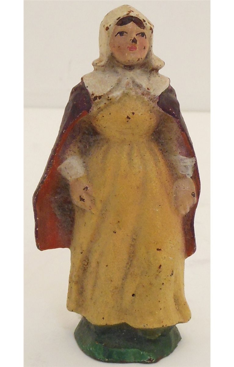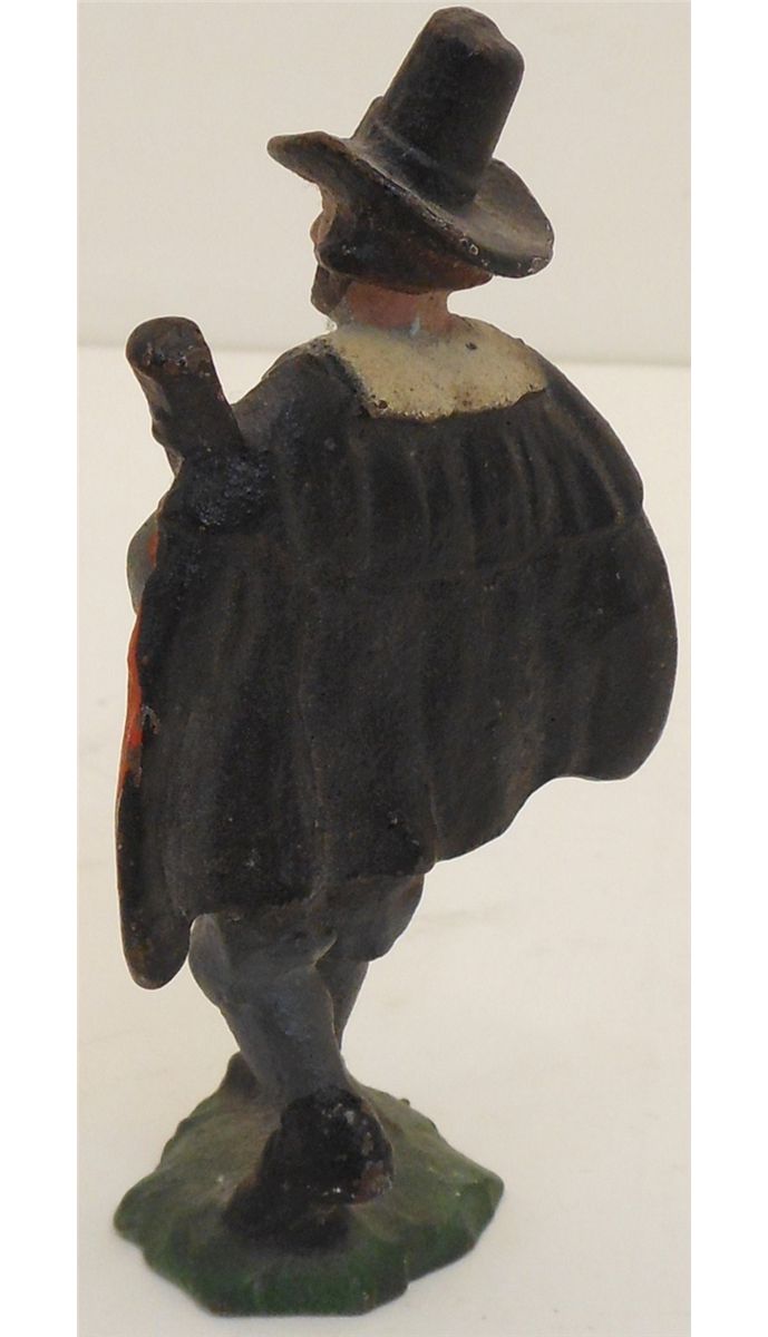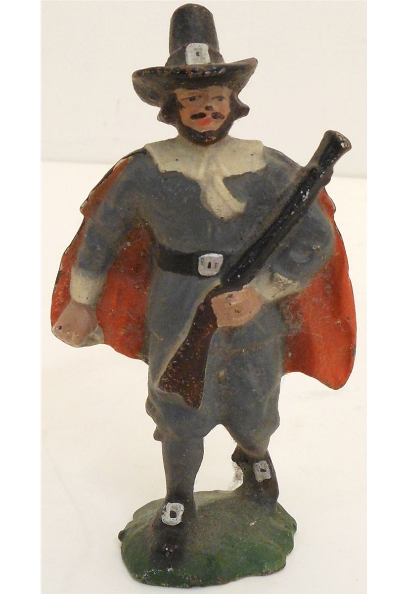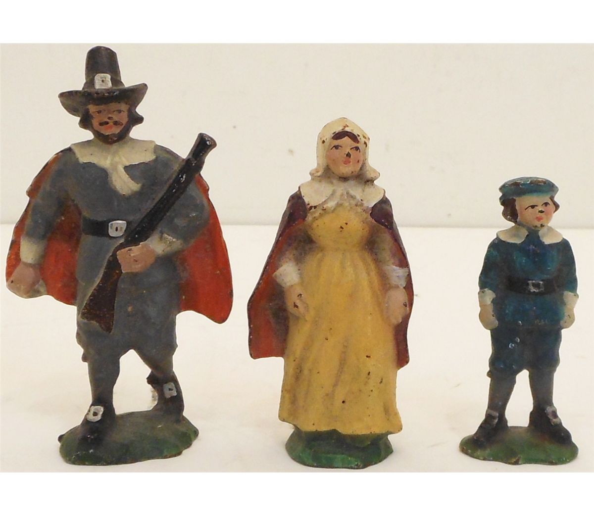 Lot of three. 3 1/4" 'Dutch boy'. 4" 'Dutch Woman' and 4 7/8" man dressed like a pilgrim caring a Blunderbuss. All three are in great condition with minor paint loss.