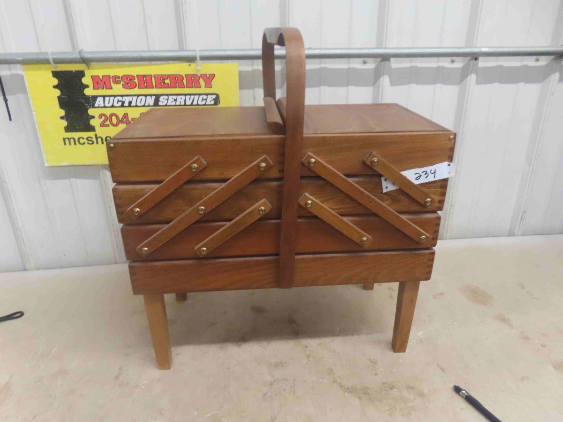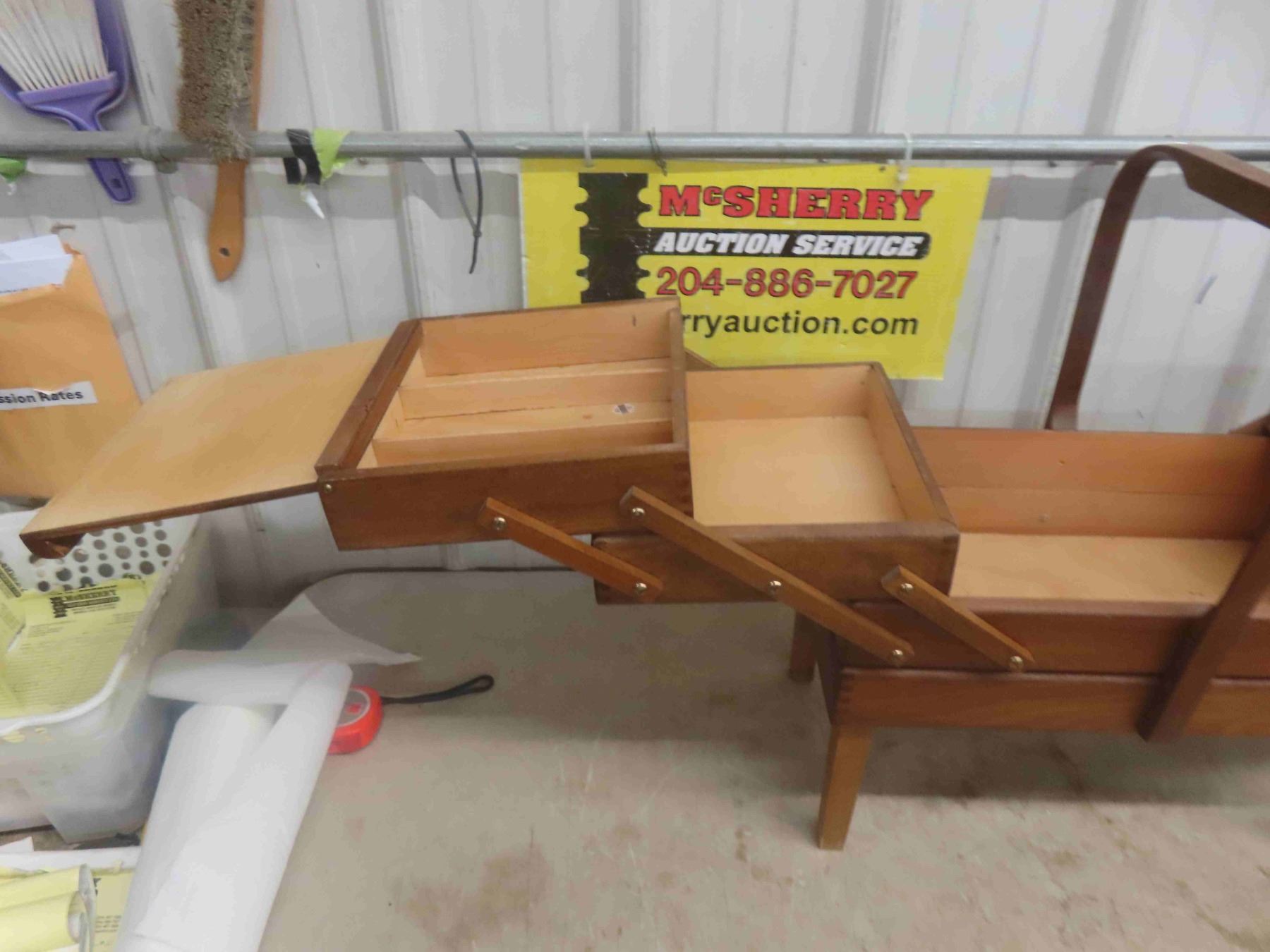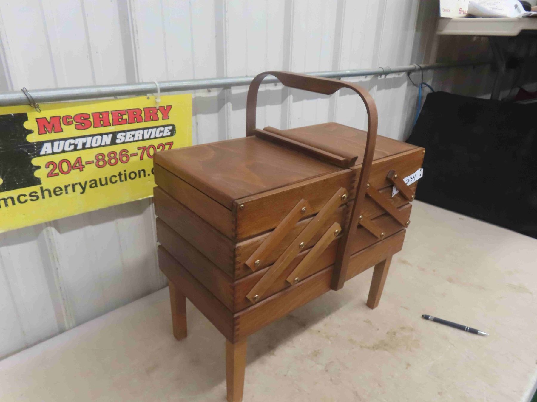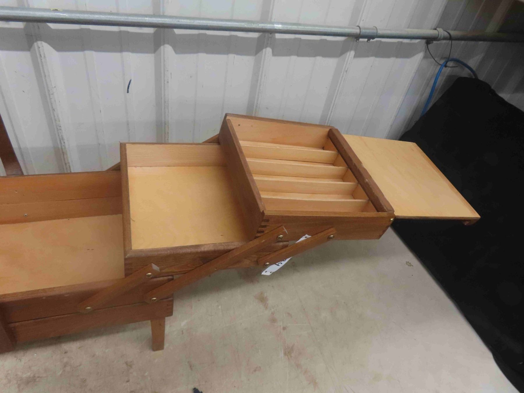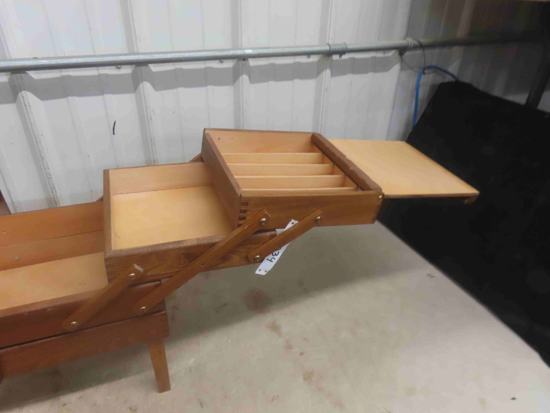 Vintage Solid Wood Fold Out Sewing Kit Box. Excellent Condition 21'' x 19'' x 10''