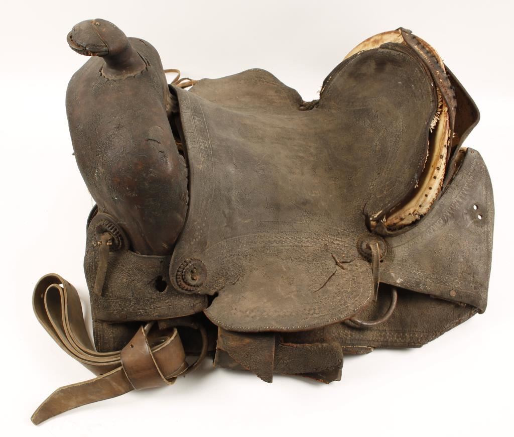 Framed horse saddle with four handmade tools. Including two hatchet like tools measuring 16" & 20", a 24" ceremonial stave & 26" mace.