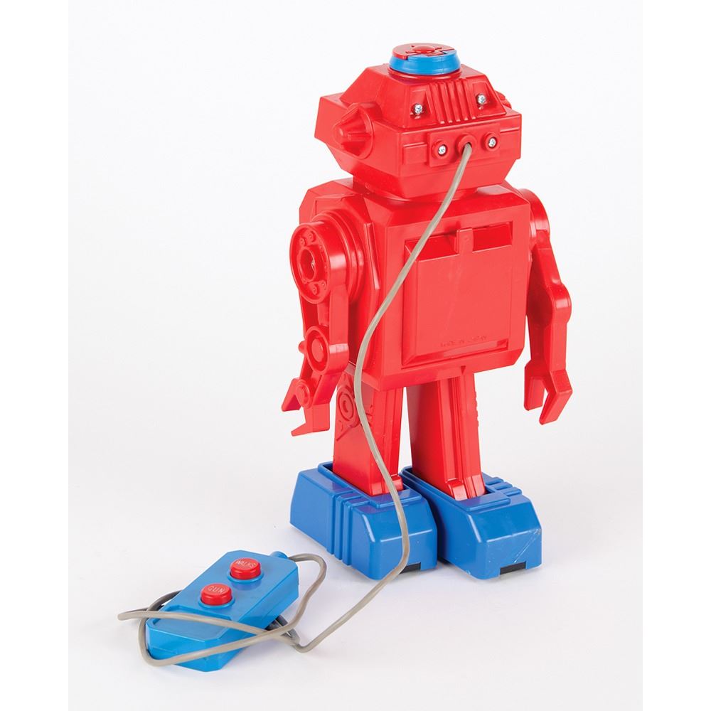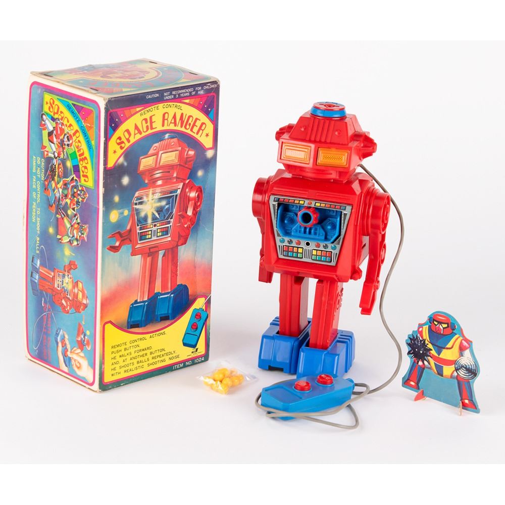 Vintage circa early 1970s remote control "Space Ranger" toy robot, made in Japan by Junior Toys, standing at 10Àù tall. Includes its original box, wired remote (with buttons for "Walk" and "Gun"), and 14 yellow plastic ammunition balls. His head flips open to load the plastic pellets, which are fired out through his chest "repeatedly, with realistic shooting noise."