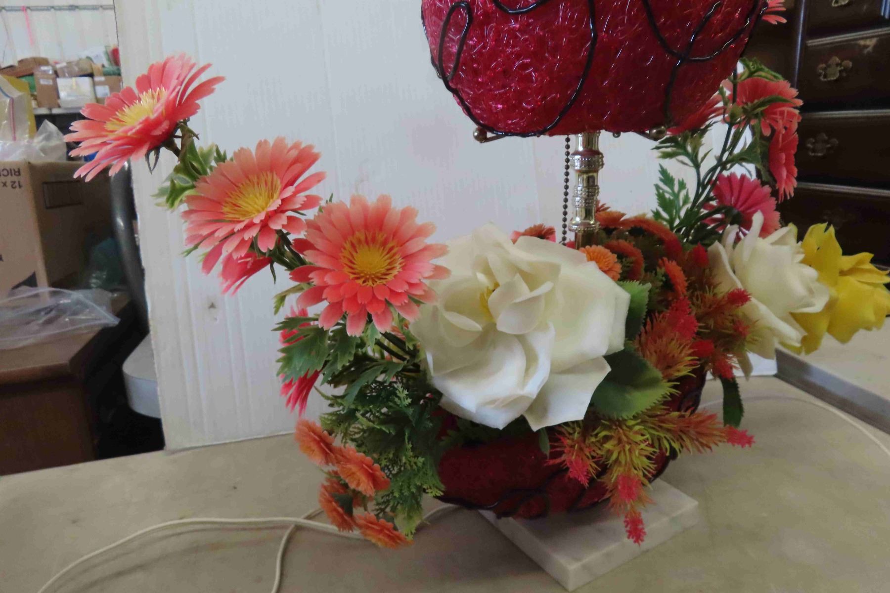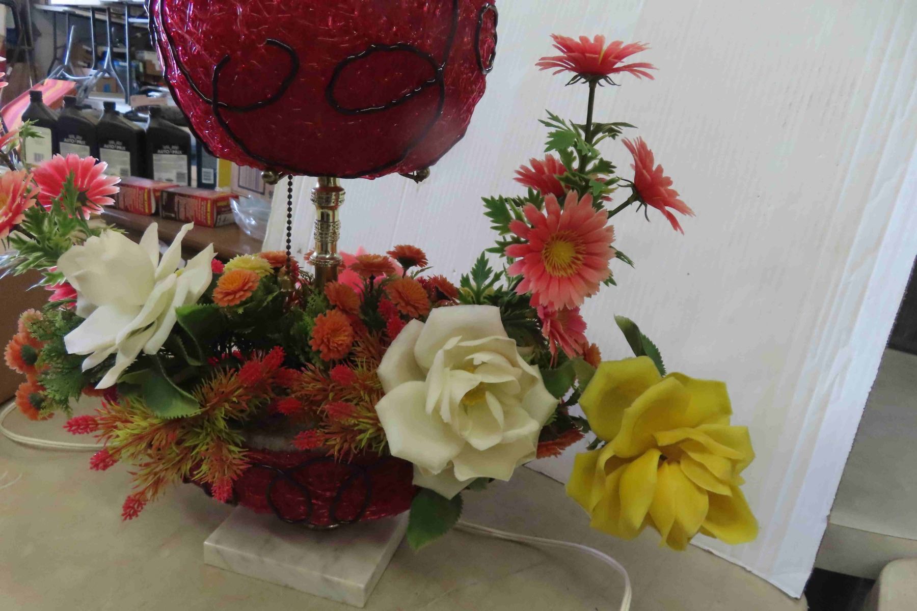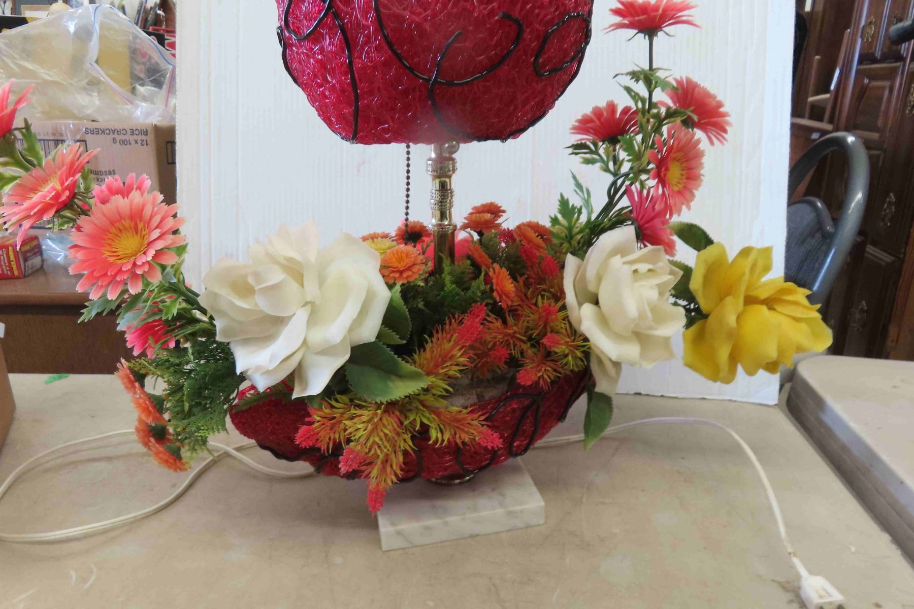 Vintage Spaghetti Lamp With Floral Display 19"x 21" In a Spaghetti Style Planter On a Marble Base