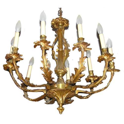 This vintage gilt bronze chandelier likely dates from the 1940s-1950s. Measures 24" wide. Ceiling plate may not be original to the chandelier. It features ten leafy scrolling arms and would look right at home in almost any antique period of decor, particularly French Louis XV, rococo, empire or even Victorian.