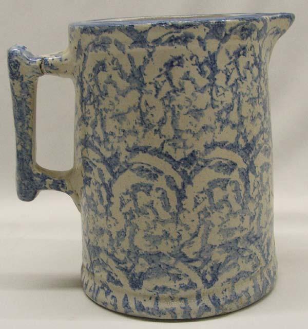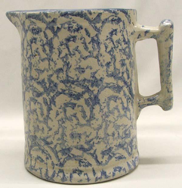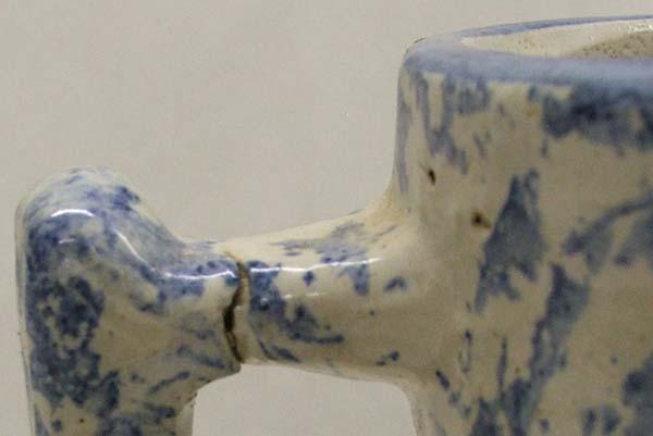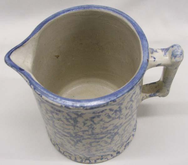 Vintage Splatterware Crock Pitcher, measures approx. 6.5''H x 7''W with handle x 5 1/2''. Some cracking on handle and hair line cracks on bottom, they do not go all the way through. Buyers Pay Actual Shipping and Handling Charges(see terms and conditions for more information).