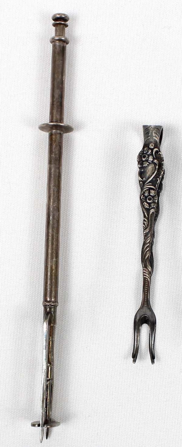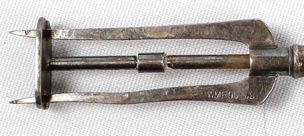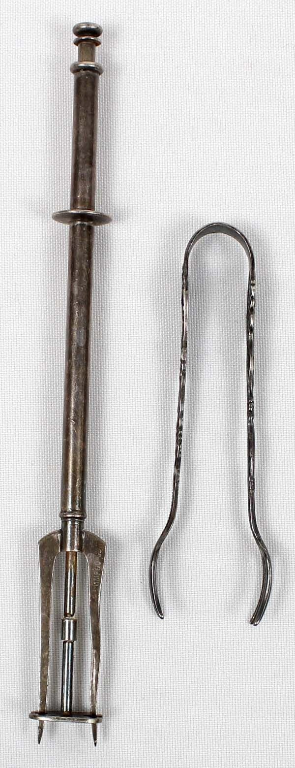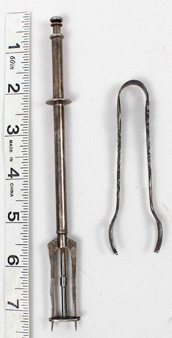 Vintage German WMF-90 Spring Loaded Olive Fork and Swedish Tongs, mechanical fork is marked WMF-90 and is made in Germany (Abstreifgabel), the silverplate tongs are marked Sweden Extra PRNS ALP, longest measures 7 7/8''L x .5''W