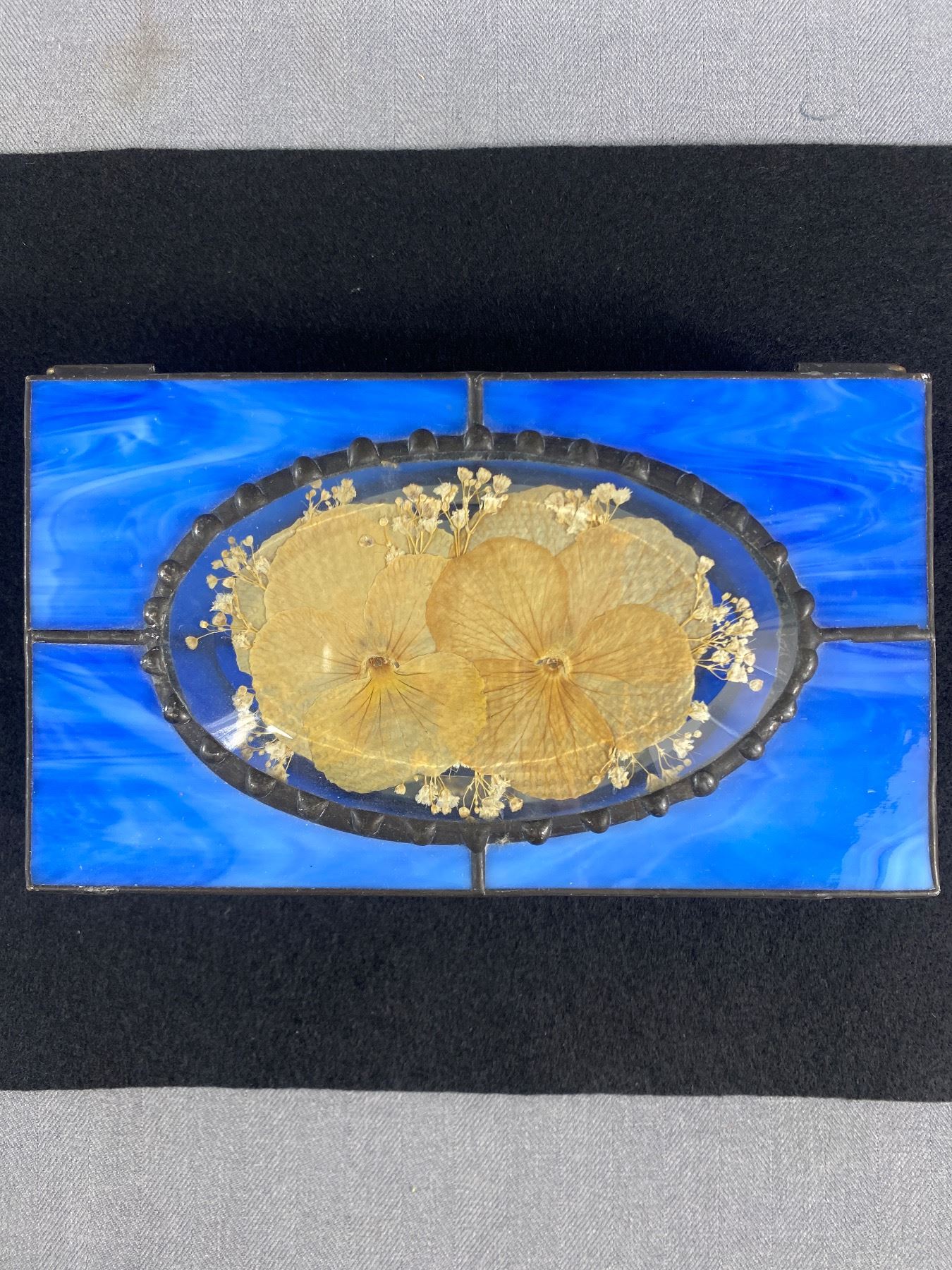 Vintage Stained Glass w/ Beveled Glass Over Dried Flowers Trinket Box. Marked Made In Canada