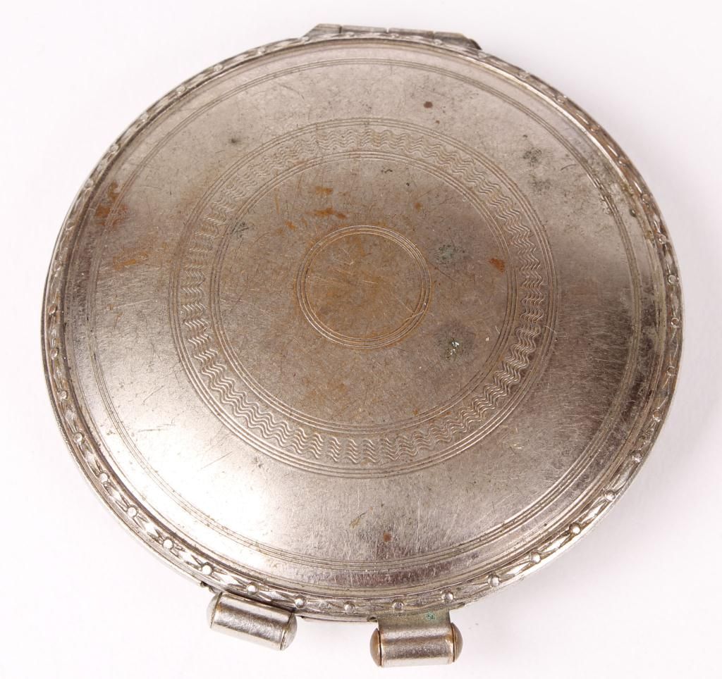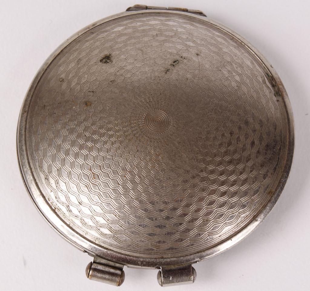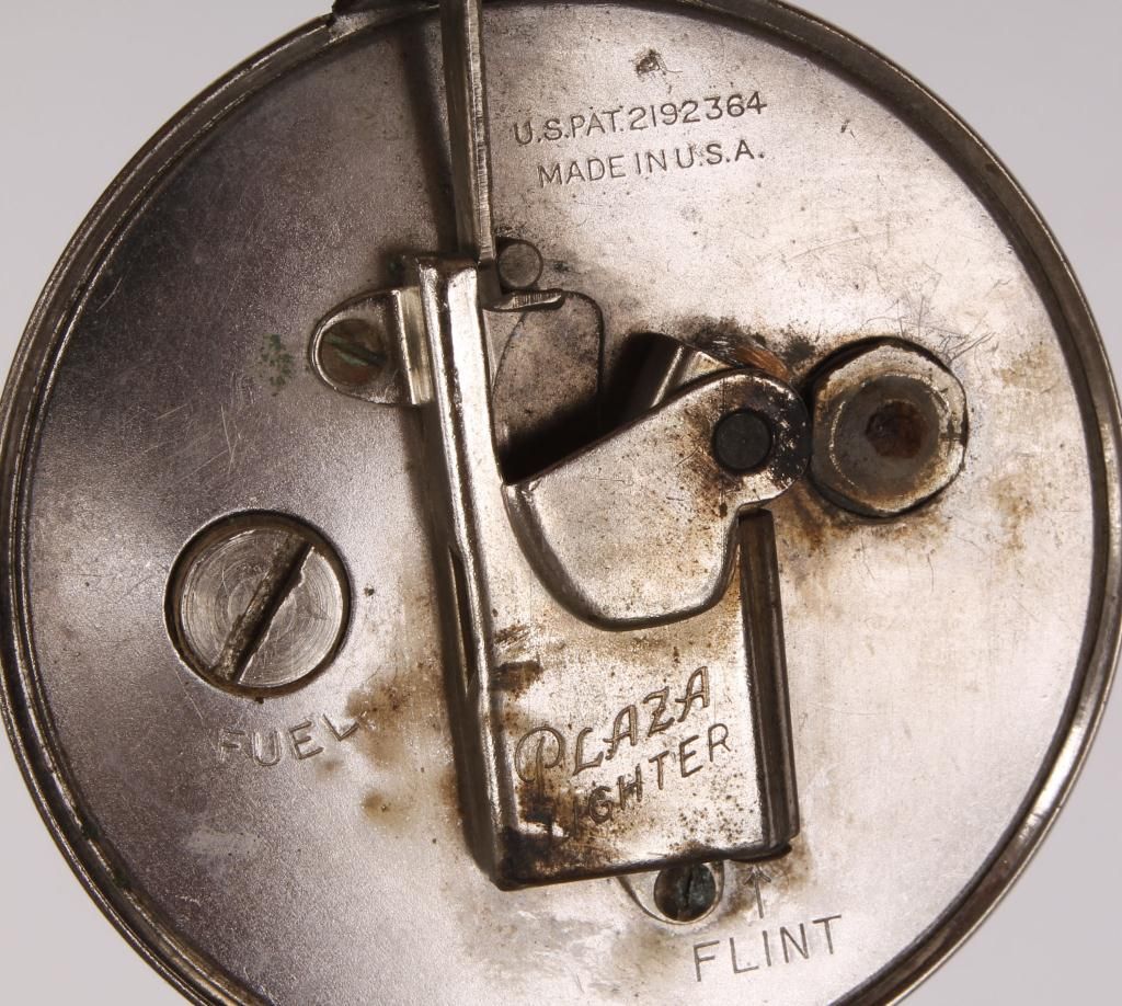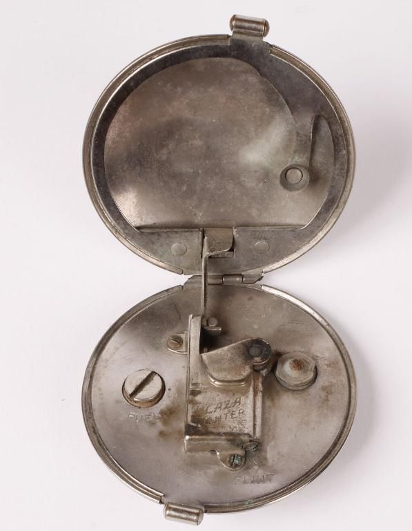 In the shape of a ladies compact with etched design, by the Plaza Lighter Co.