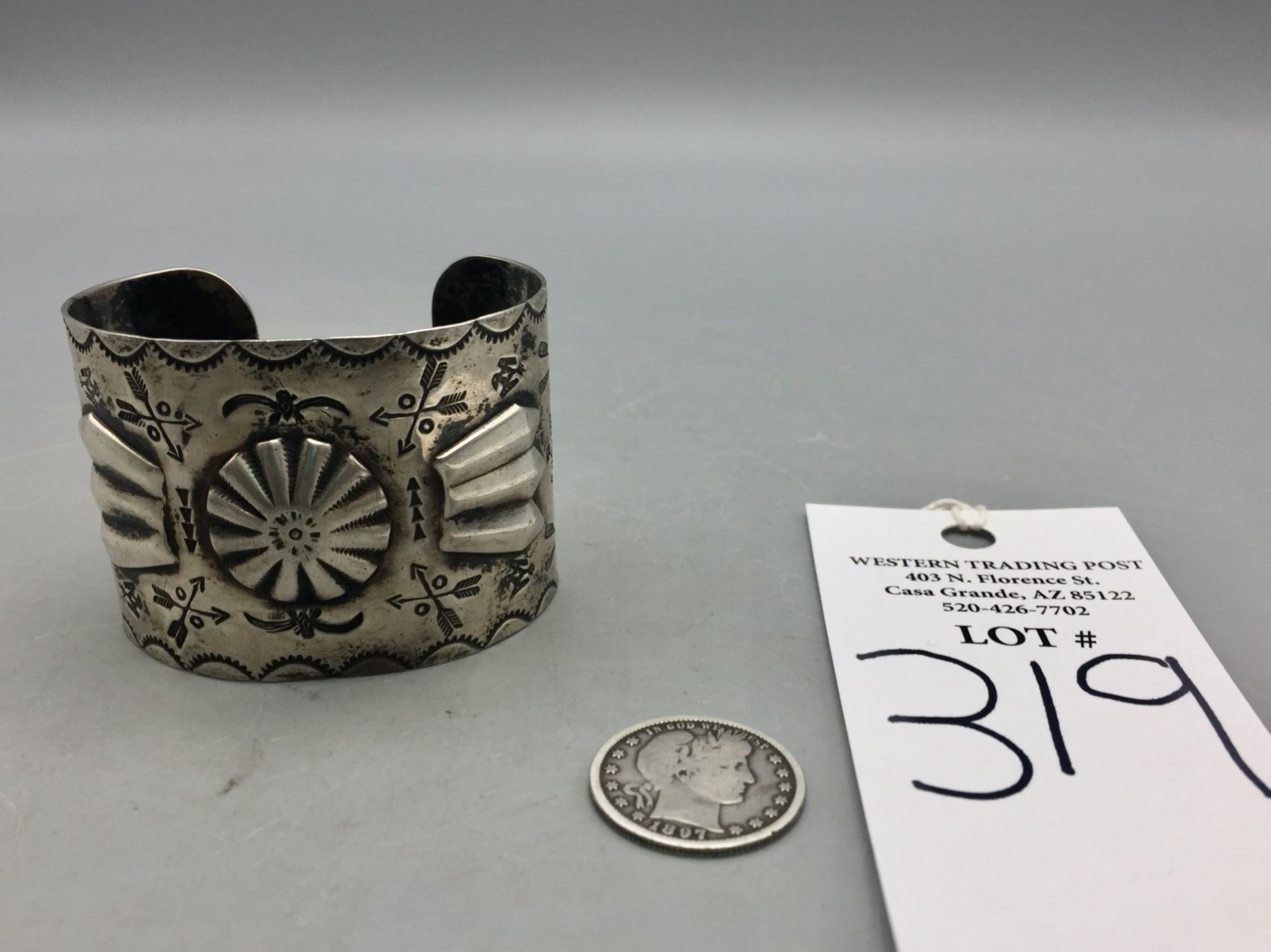 Description: Offered for sale in this lot is a beautiful vintage stamped bracelet with repousse work. This bracelet has numerous stamped designs including arrows and thunderbirds. It is sterling silver. Maker: Unmarked. Approx. Age: Vintage. Size: Inside circumference measures 5-5/8 inches. Opening is an additional 1 inches, fitting a 6-5/8 inch wrist. Width is 1-3/4 inches. Weighs 55.8 grams. Condition: Good for its age, normal wear expected. Please look closely at the pictures - they are an important part of our description. Shipping: There will be a $5 handling, packaging fee for shipping this lot. The actual cost of postage will be added on top of that.