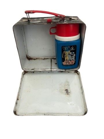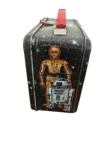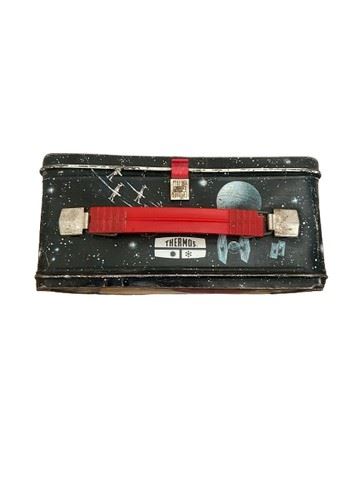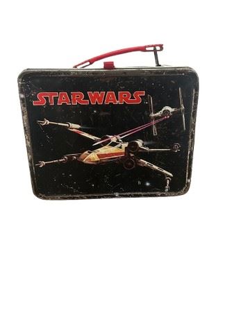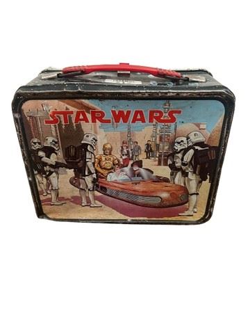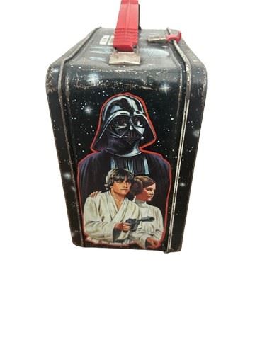 Relive the magic of a galaxy far, far away with this authentic vintage Star Wars metal lunch box, complete with its original matching thermos. Released in 1977, this collectible features iconic artwork from the original trilogy, showcasing beloved characters like Luke Skywalker, Princess Leia, Darth Vader, and more. Includes matching thermos with intact lid and cup. Durable metal construction with working latch and handle (one side of the handle is cracked).