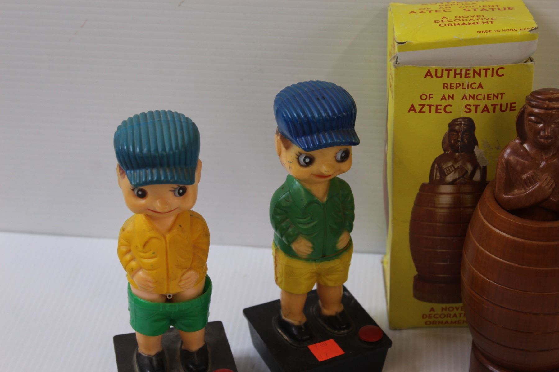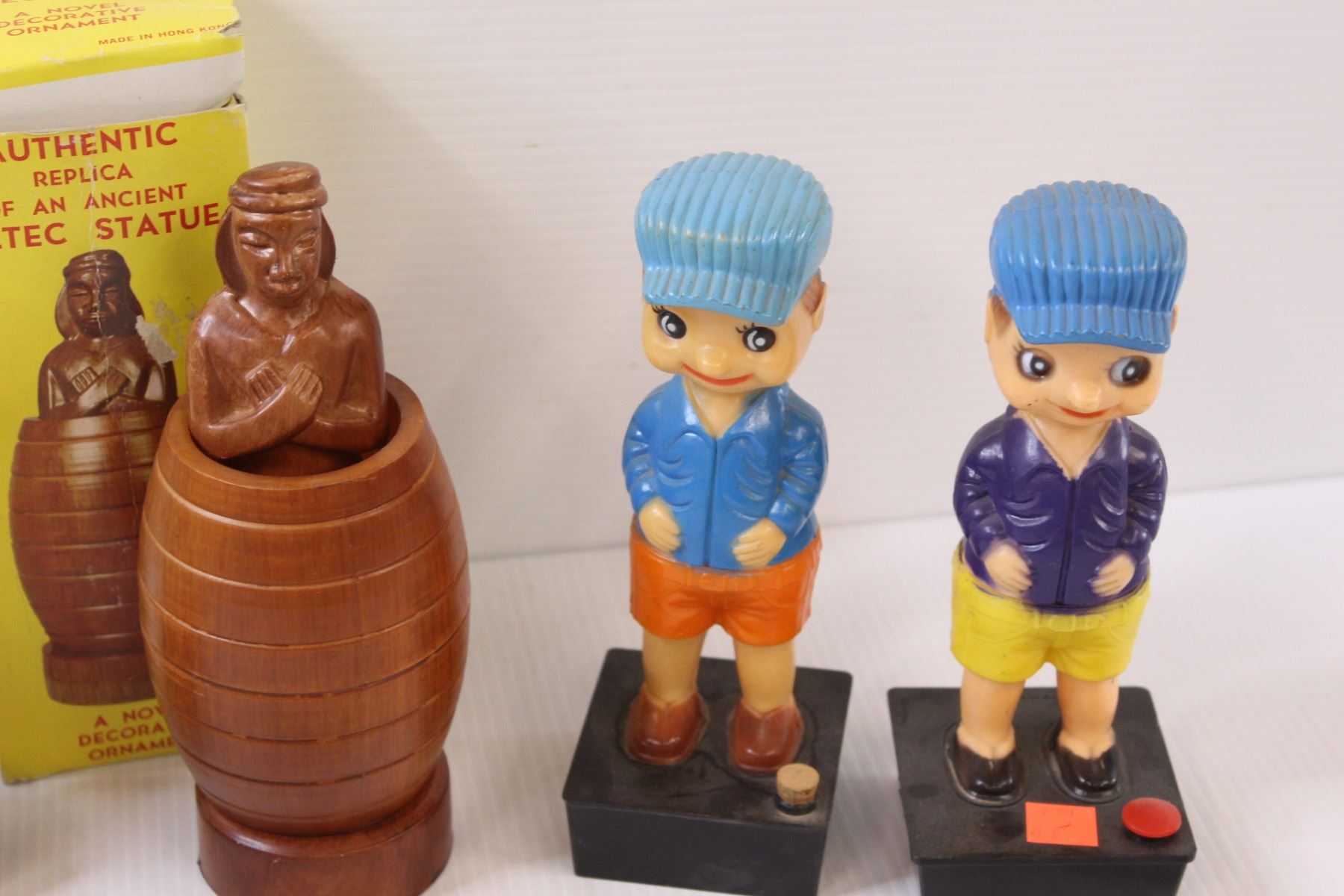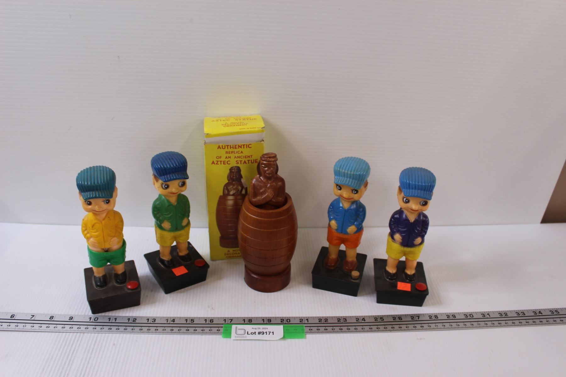 Vintage Statues: Aztec in a Barrel & Boys Button Activated Toy