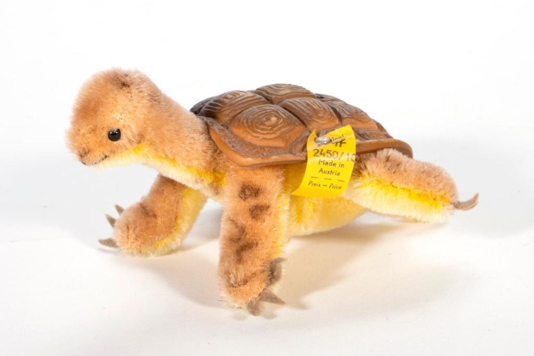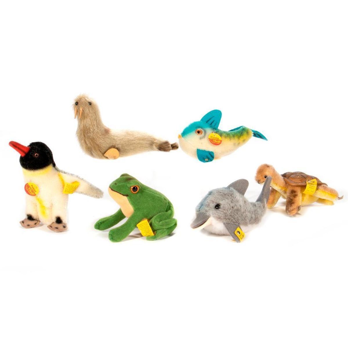 Group of 6 vintage Steiff all having original tag and button. Walrus Frog Turtle Fish Peguin Whale Largest measurement at 6 inches.