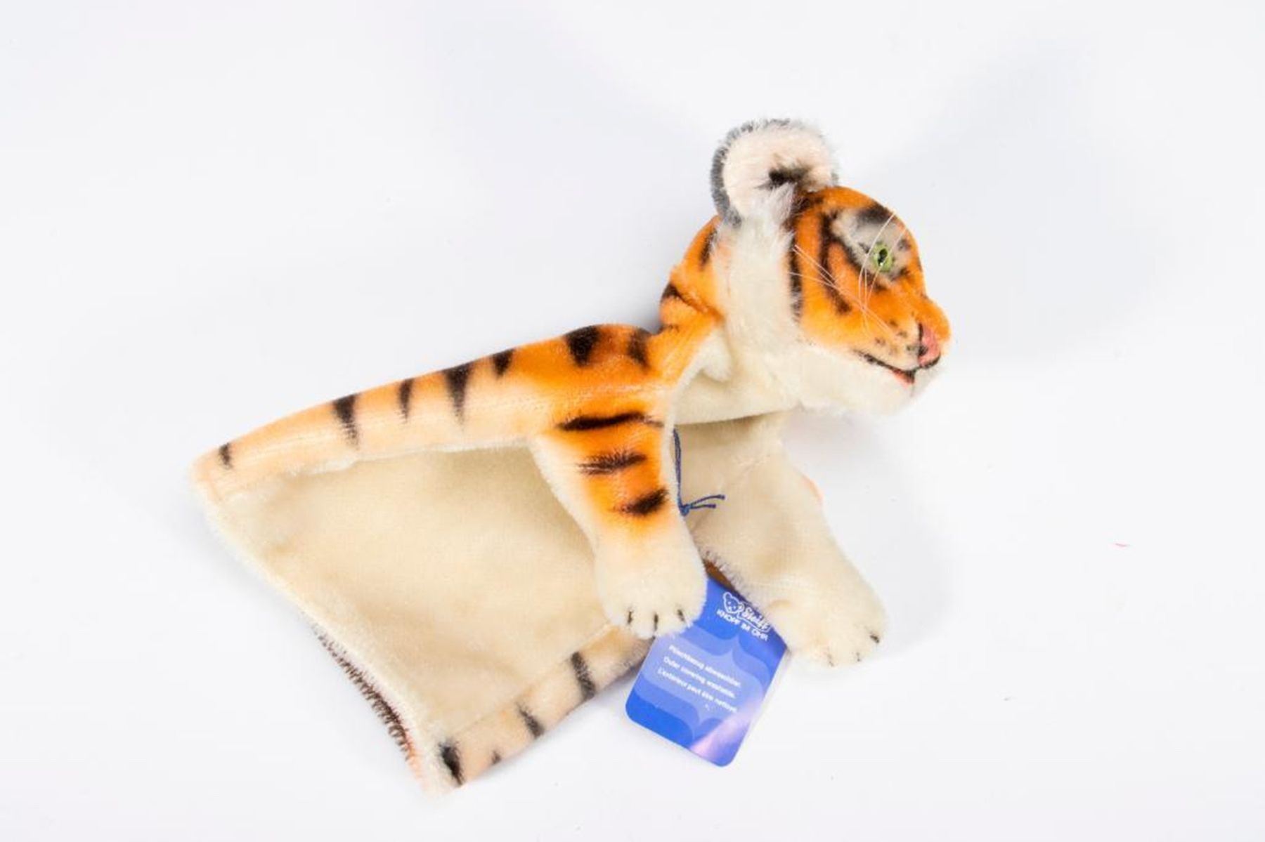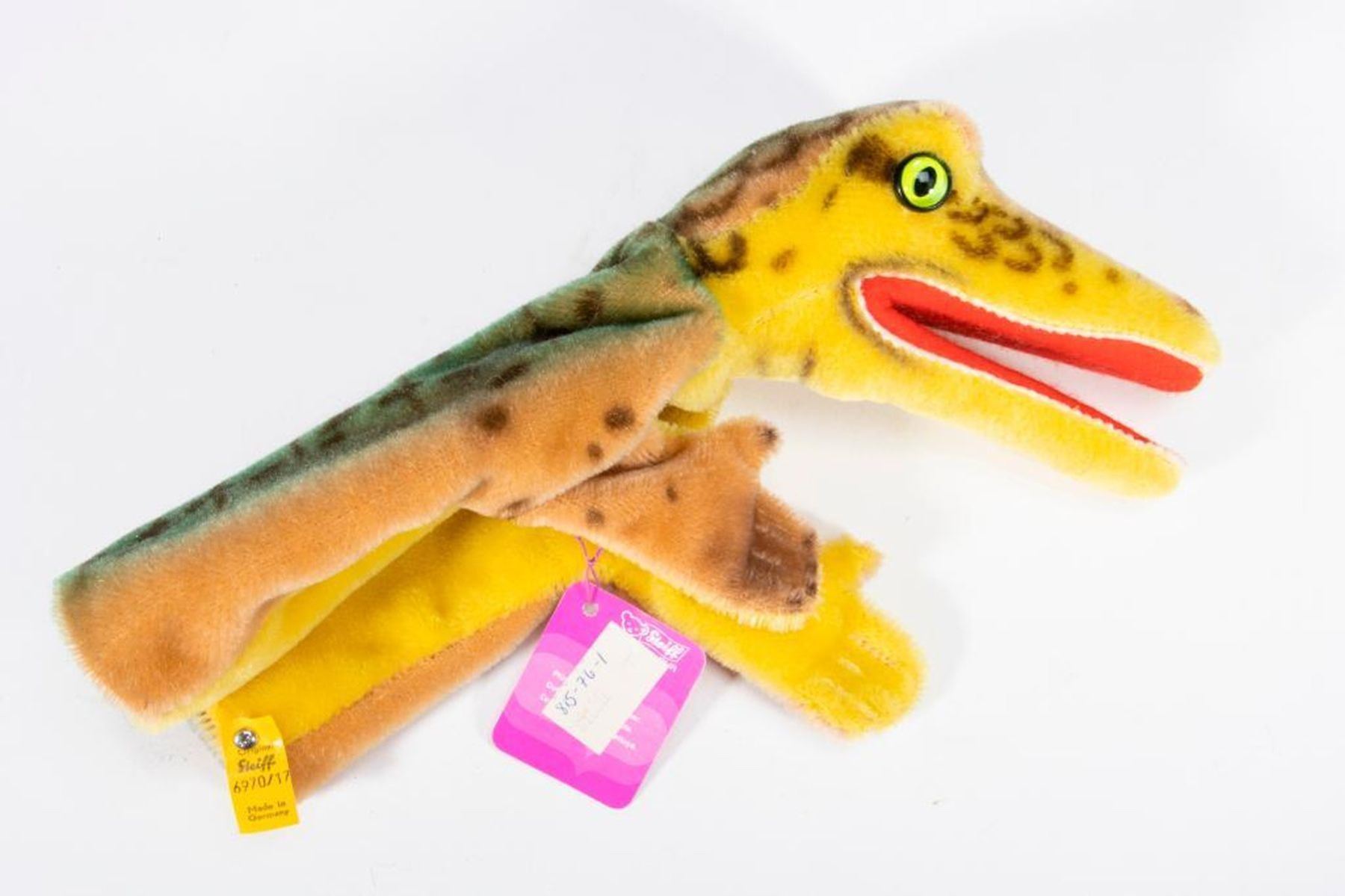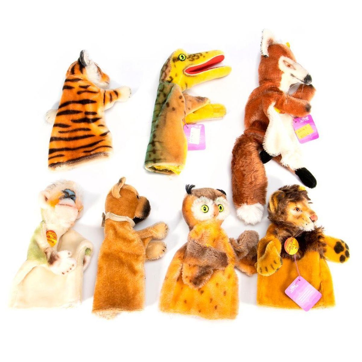 Group of seven vintage Steiff hand puppets. All retain original tag and button except for the dog. Dog, Owl, Tiger, Monkey ,Fox, Lion and a Alligator. Largest measurement at 10 inches.