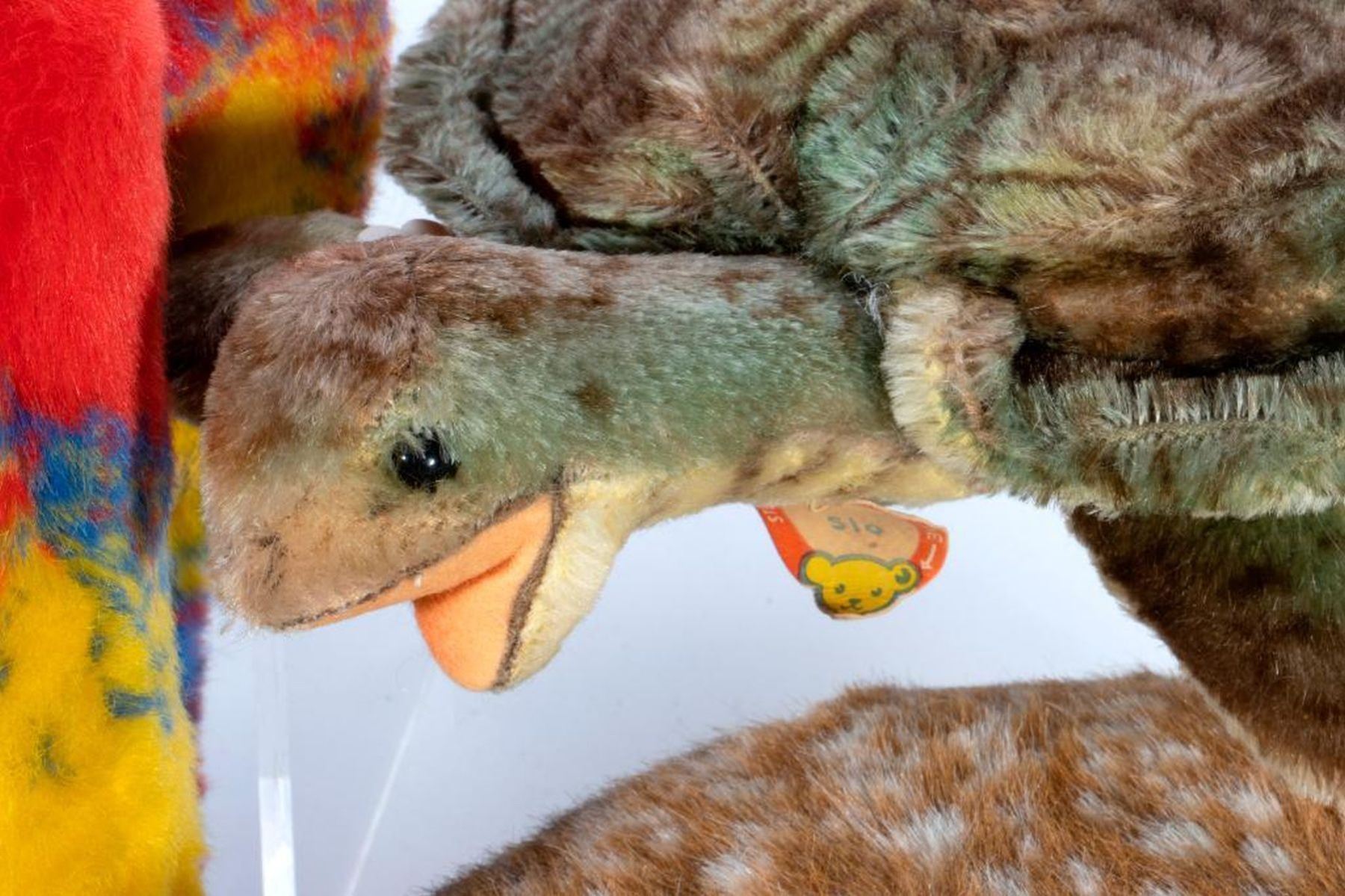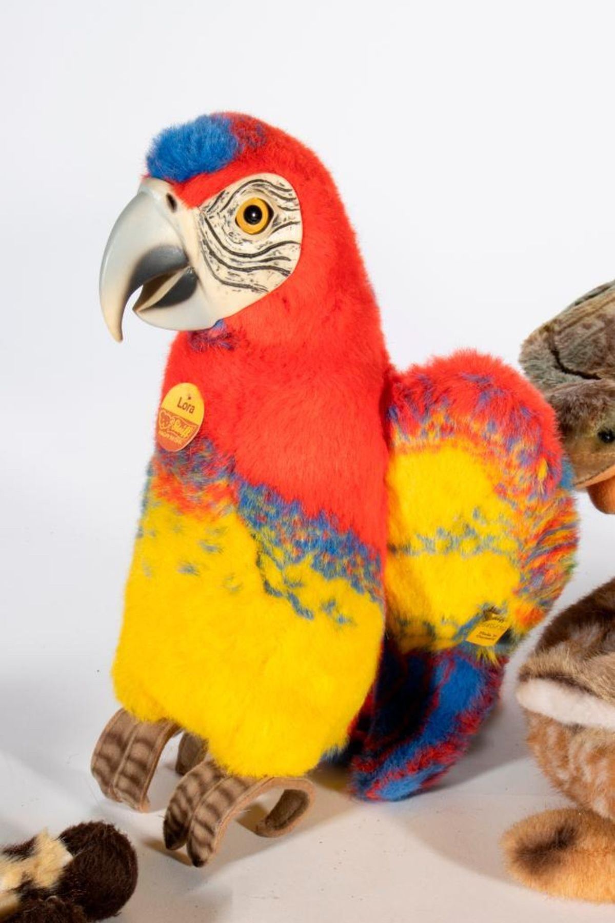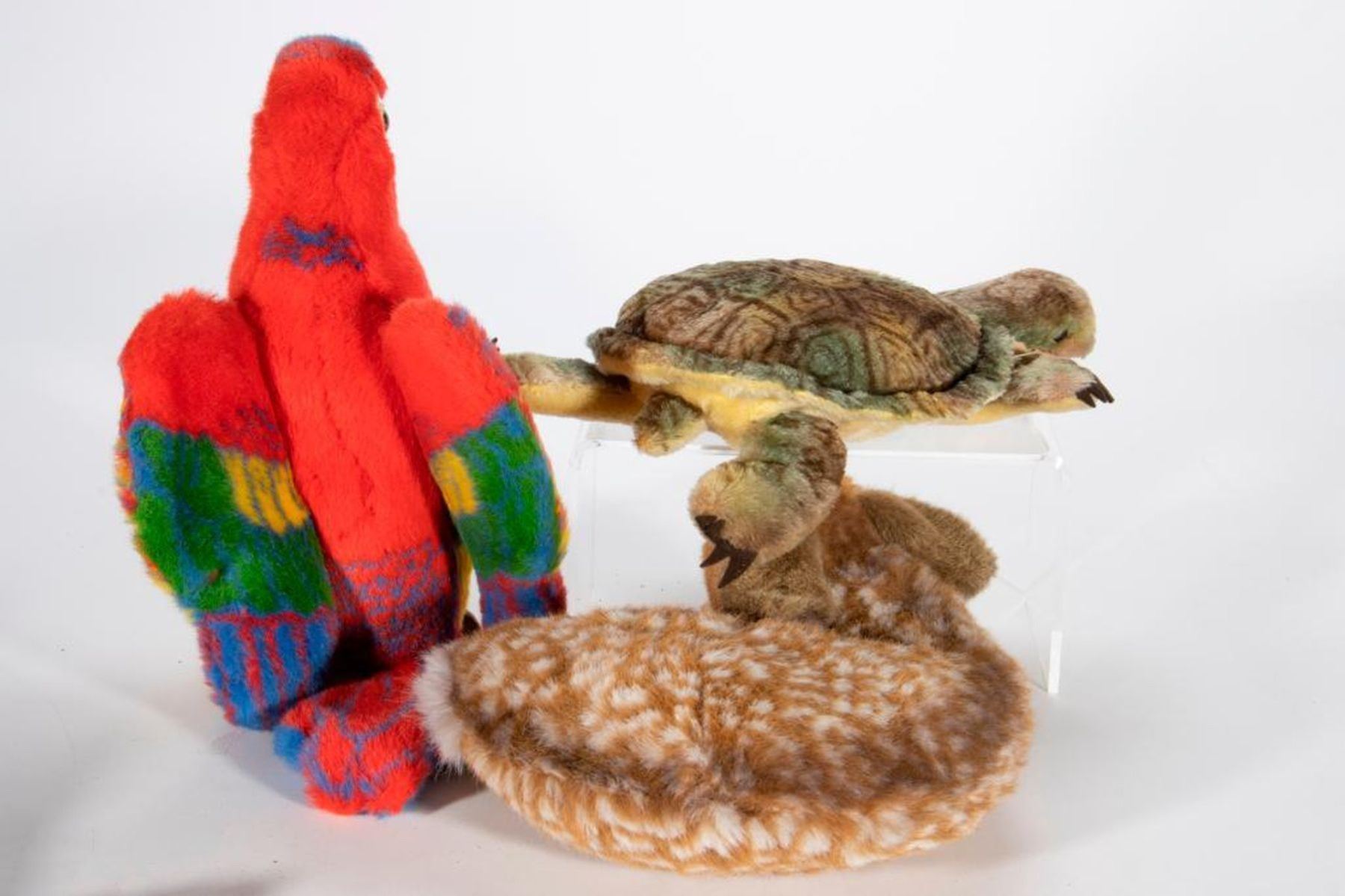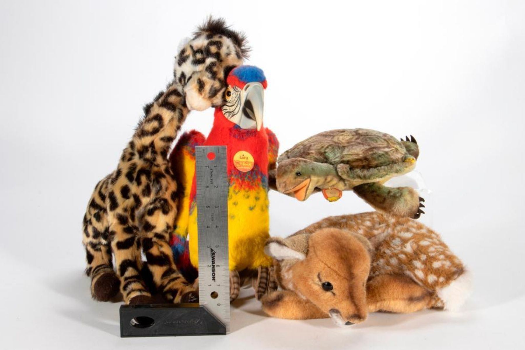 Three large vintage mohair Steiff 1960's-1970's, consisting of Lora parrot, Slo turtle and Lorli Deer. Plus one vintage giraffe with a tag reading Aux Nations Made in France. The largest measurement 18 inches