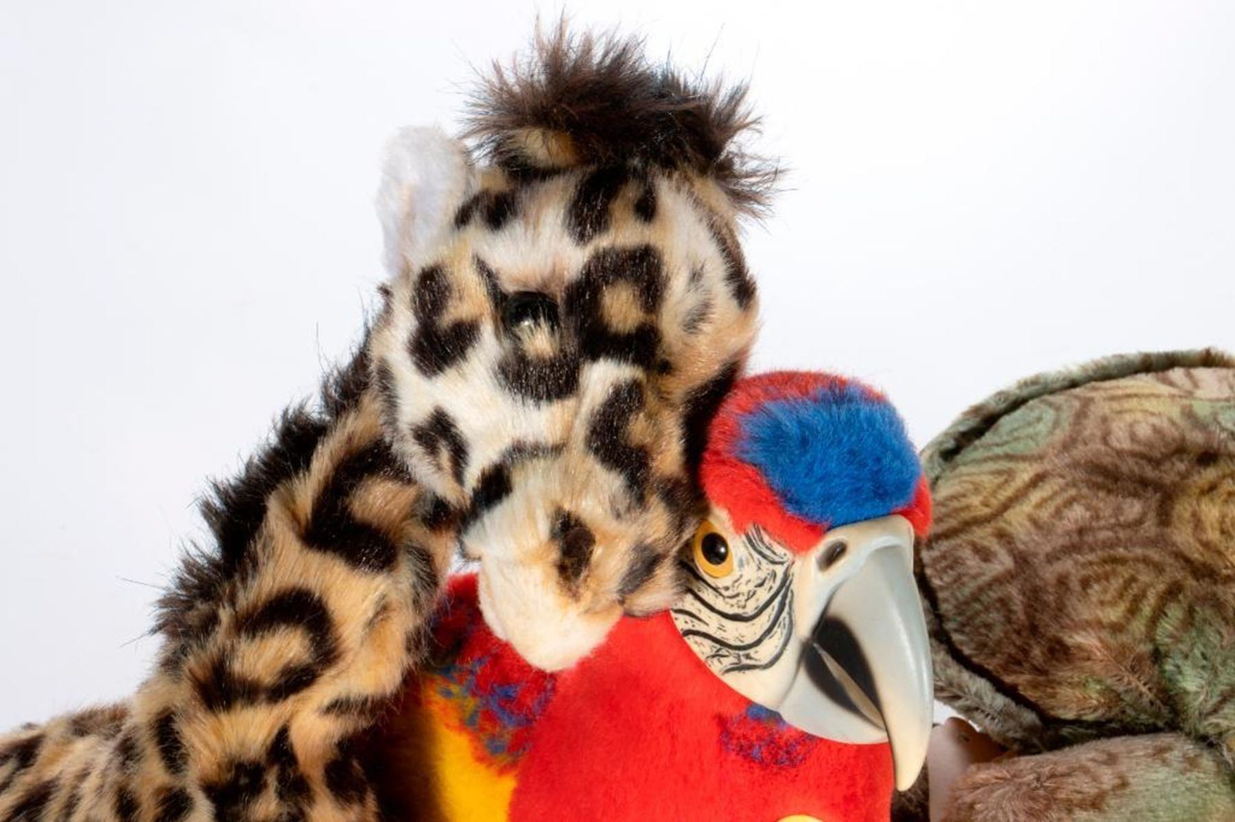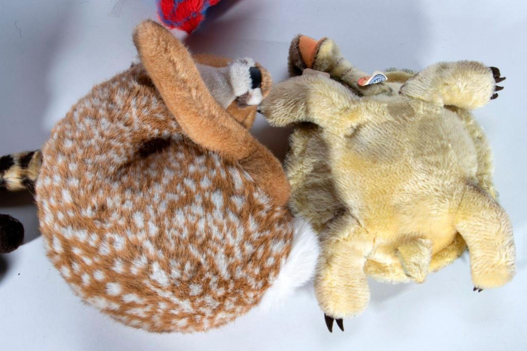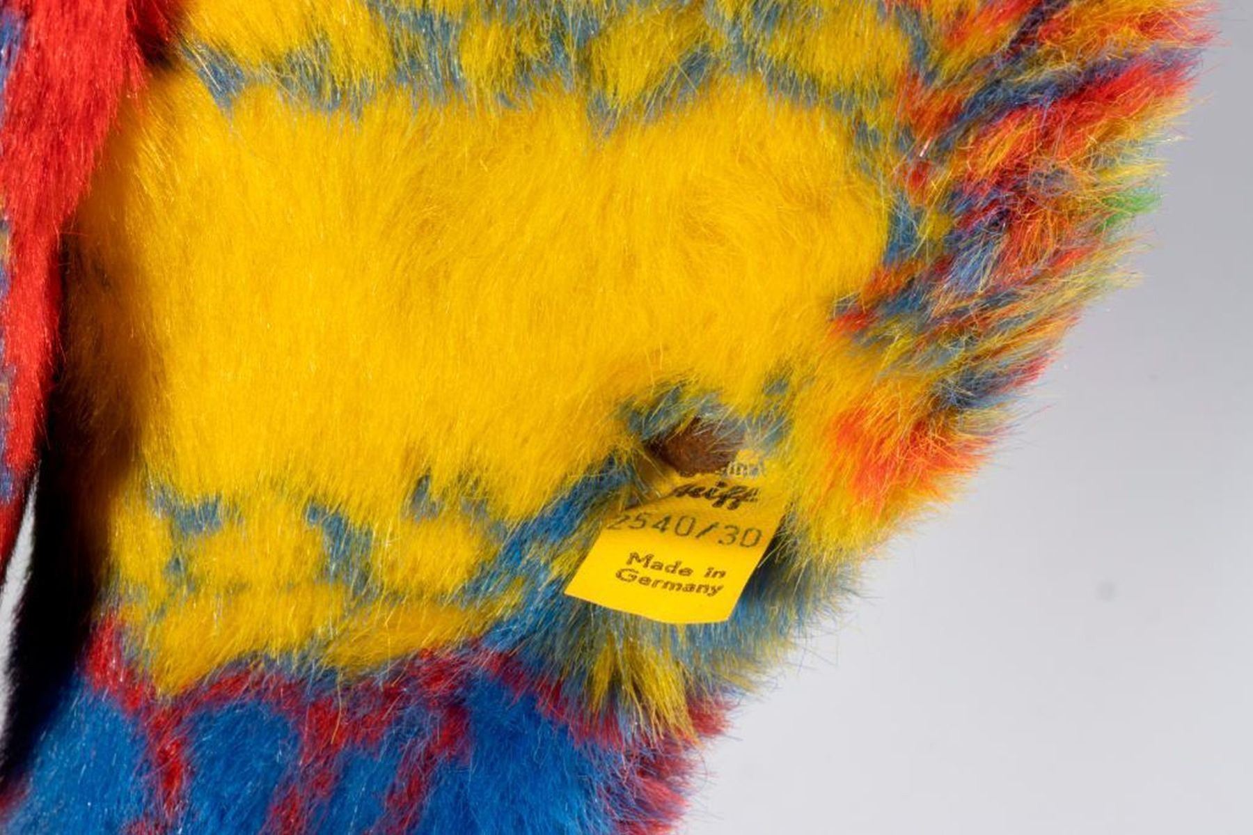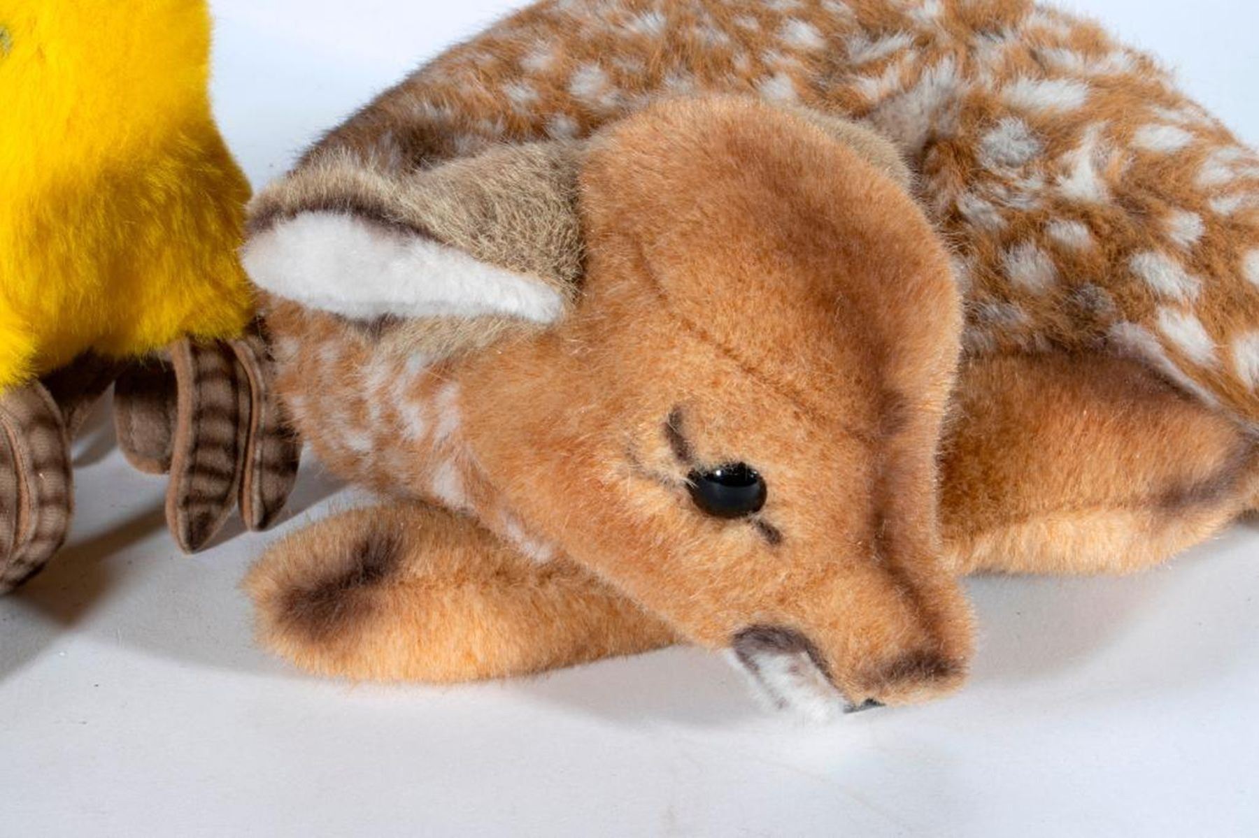 Three large vintage mohair Steiff 1960's-1970's, consisting of Lora parrot, Slo turtle and Lorli Deer. Plus one vintage giraffe with a tag reading Aux Nations Made in France. The largest measurement 18 inches