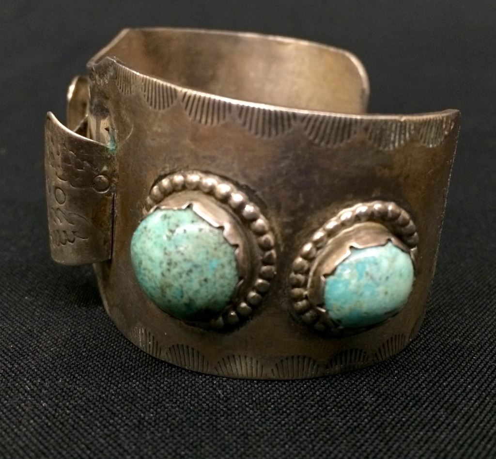 This vintage sterling and turquoise watch cuff has never had a watch face in it (new old stock)! Tested as sterling silver. No maker’s hallmark which was common on Native American Indian jewelry made in the 1970s and prior. Measures 5.75” inside circumference plus there is a 1.5” opening. It is 1.5” at the widest point and weighs 83.1g