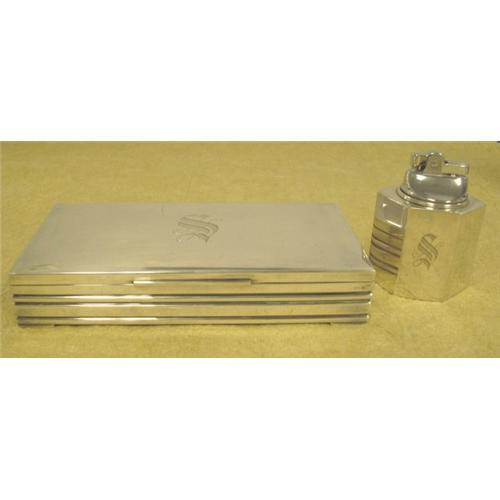 Auction is for a monogrammed 7.5" x 4" x 1.5" cigarette box/humidor with hexagonal 3.75" x 2.5" table lighter. Marked "For JC Boardmann & Co Sterling Denmark". In excellent condition.