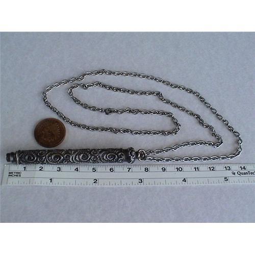 Working retractable pencil with heavy silver neckchain is marked sterling at the beginning of the shaft section and at the clasp of the necklace. Shaft is ornately decorated with repousse in scroll pattern. Individual links of the 24 inch chain has horizontal ringed grooves for added exquisite workmanship.Clasp says sterling.Will ship worldwide. Insurance optional
