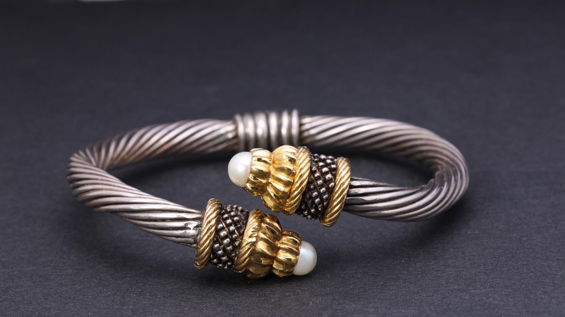 Vintage Sterling Silver & 18K Gold Crossover Bracelet with Natural Pearls. Total weight is 36 gm. Estimated retail value $1,200.