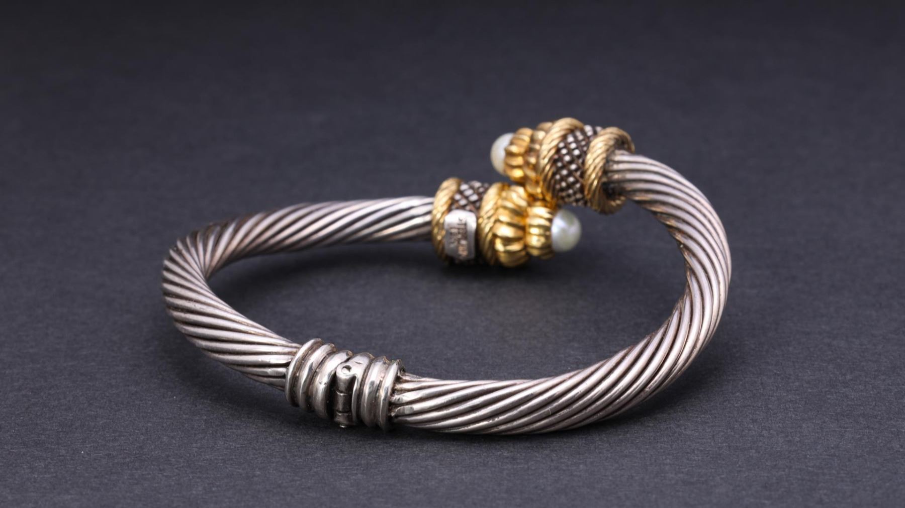 Vintage Sterling Silver & 18K Gold Crossover Bracelet with Natural Pearls. Total weight is 36 gm. Estimated retail value $1,200.