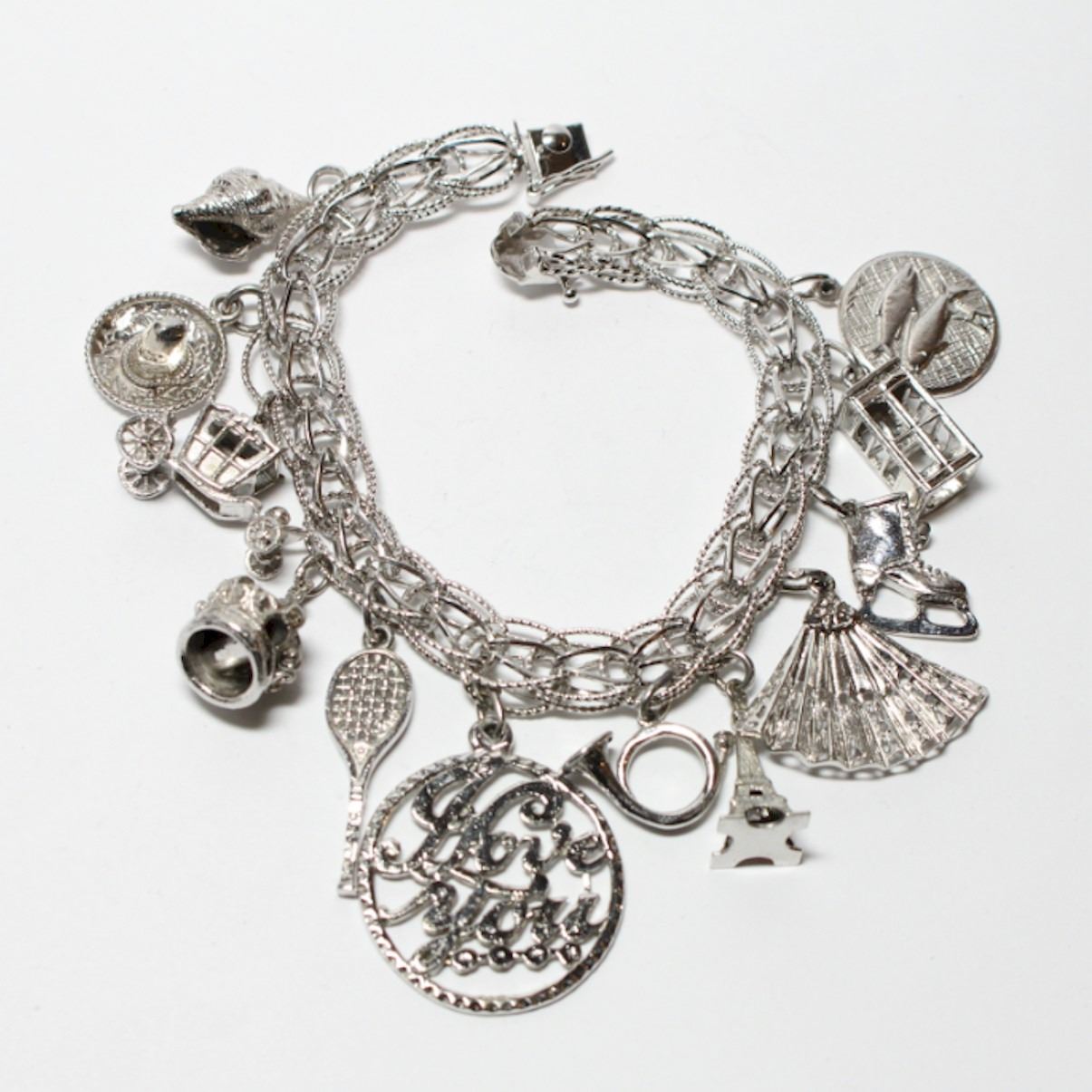 Vintage Sterling Silver Charm Bracelet with 12 Assorted Charms. Weight of 41.89 grams.